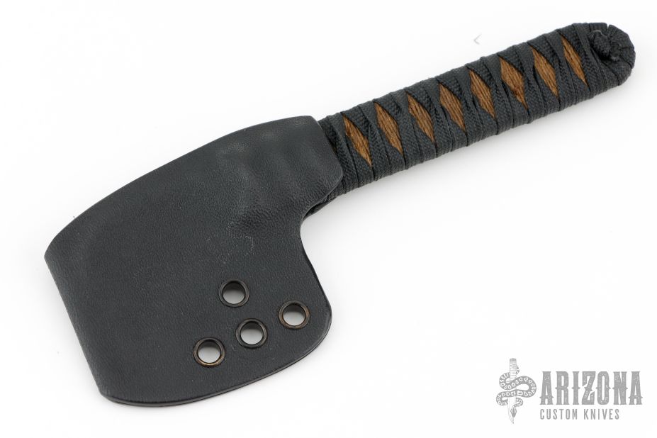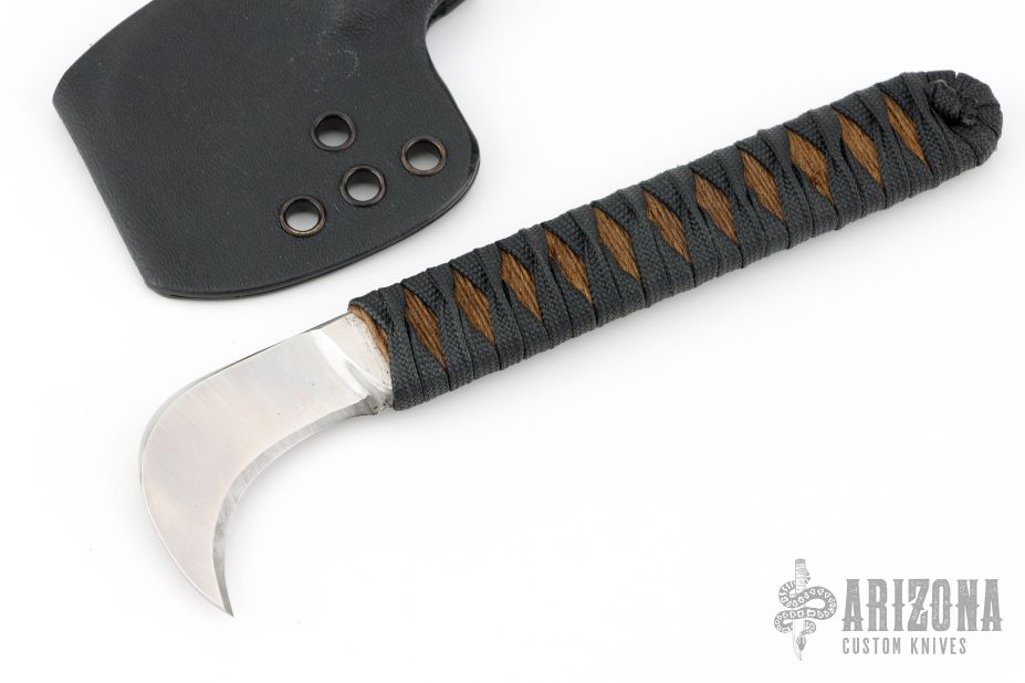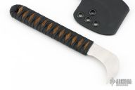 This knife features a satin finished chisel ground, gut hook blade with epoxied black/brown cord wrap handle, .196" blade stock and .831" blade depth. Comes with kydex sheath. Has some light scuffs, excellent condition otherwise.