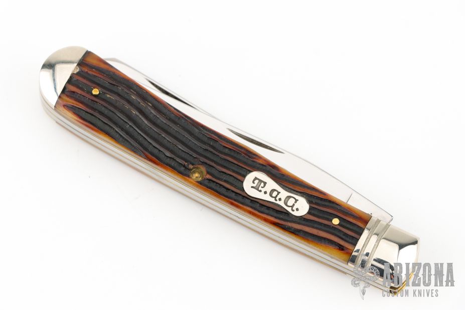 This Trapper by by Queen Cutlery was made for Titusville Cutlery Company. It features polished blades with nail nicks. The handle has pinched and fluted nickel silver bolsters, jigged bone covers, brass liners and stainless steel spring. Comes with original box and papers. Excellent condition. 1 of 100