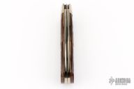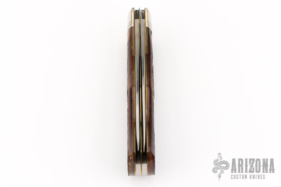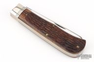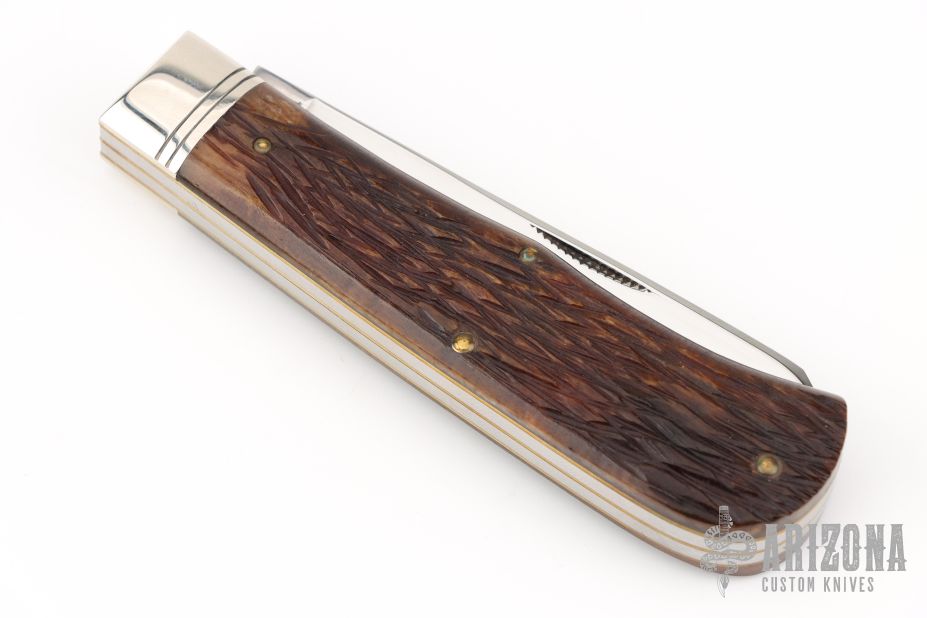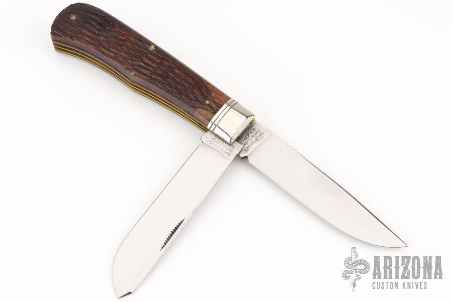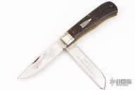 This Trapper by Schrade Cutlery features two mirror polished blades both with nail nicks and false top edges. The handle has nickel silver bolsters, brown pick bone covers with nickel silver escutcheon, brass liners, and stainless steel springs. Excellent condition.