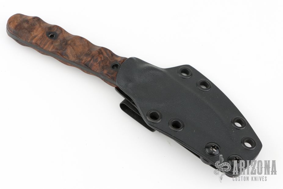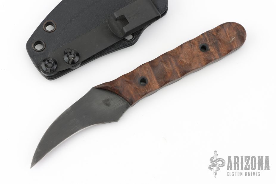 The Diavel by Ironside Edge Works features a black hawkbill style blade with .114" blade stock and .857" blade depth, full tang construction. The handle has American walnut scales.  Includes a kydex sheath, original box and papers.  K460 Blade Steel.  Has light sheathing marks otherwise Excellent Condition.