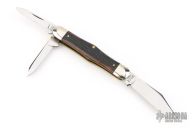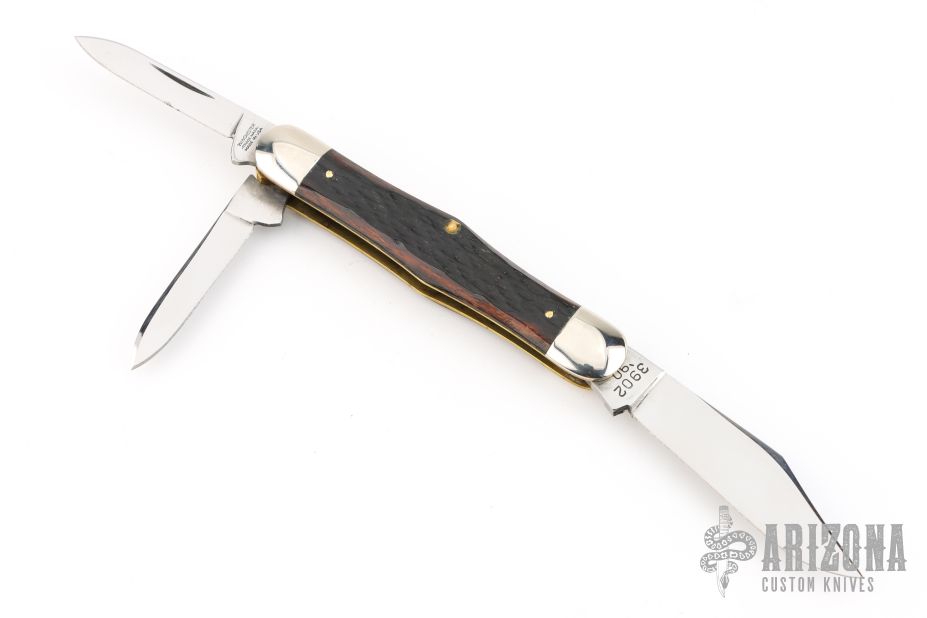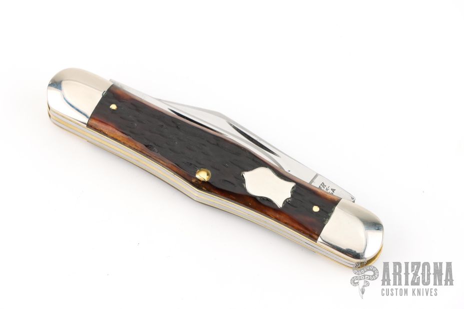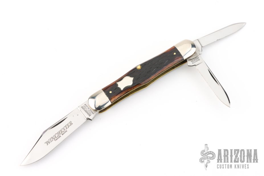 This Winchester 3-Blade splitback whittler features three mirror polished blades. Nickel Silver front and rear bolsters with jigged bone covers. Brass liners and steel springs. Original box. Excellent condition.