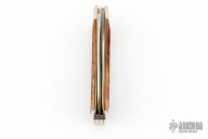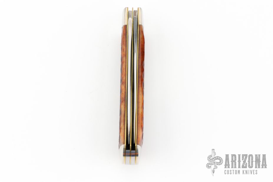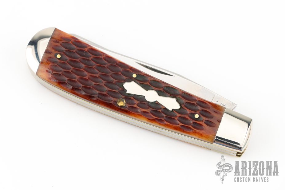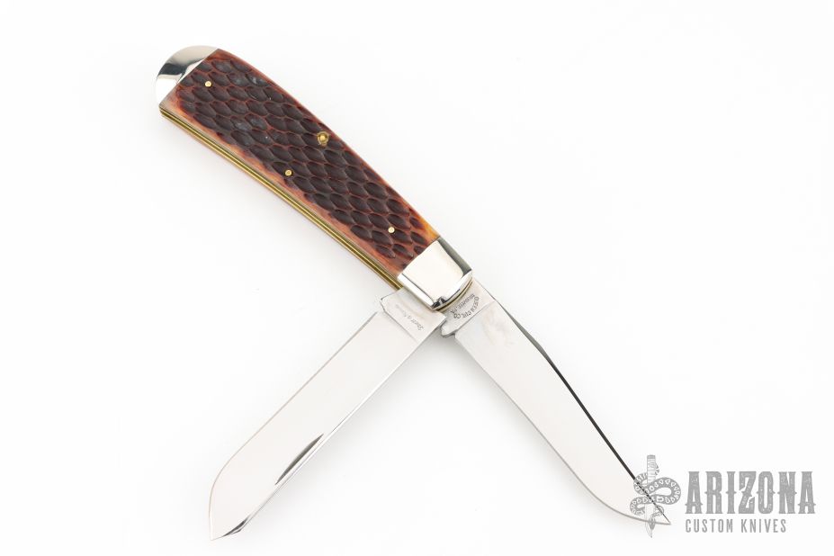 This knife by Queen City Cutlery Company features mirror polished blades with nail nicks. The handle has nickel silver bolsters, jigged bone covers, nickel silver escutcheon and liners, stainless steel springs. Has half-stops. Comes with original box. Excellent condition.