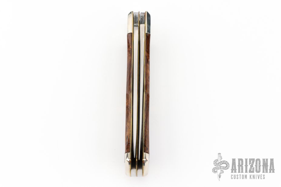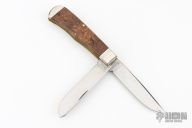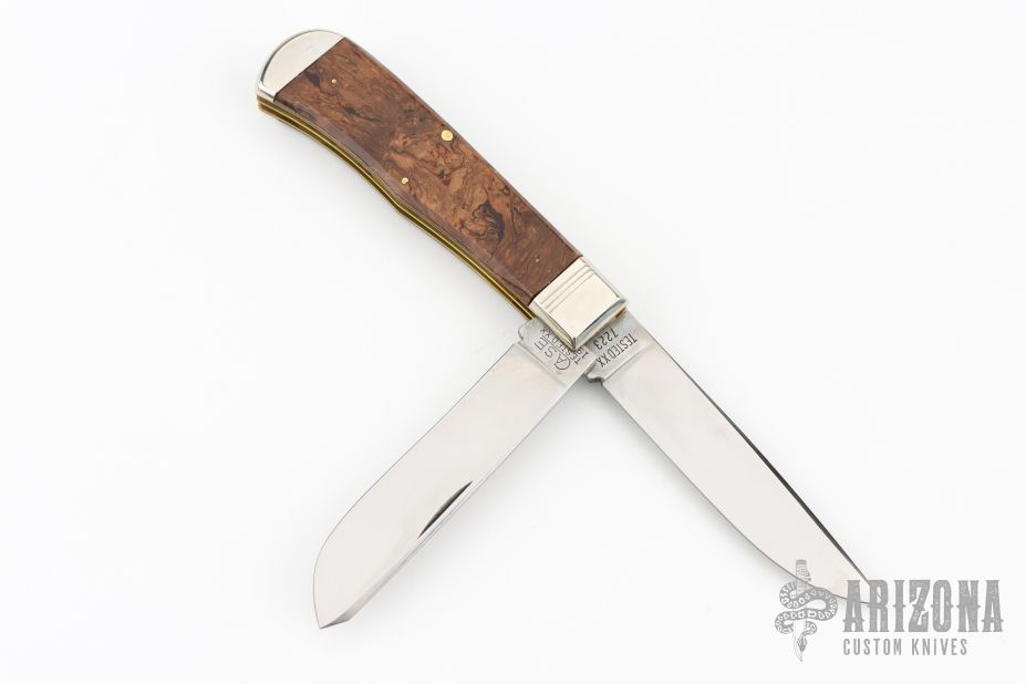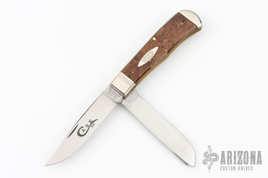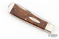 This 2-Blade Flush Joint Jumbo Trapper by Case Knives features mirror finished blades with nail nicks. The handle has nickel silver bolsters, burlwood and glitter stripe covers with nickel silver escutcheon, brass liners and steel springs. Has half-stops. Has some light scratches, otherwise excellent condition.  Dated 1993. 250 made