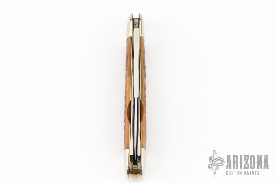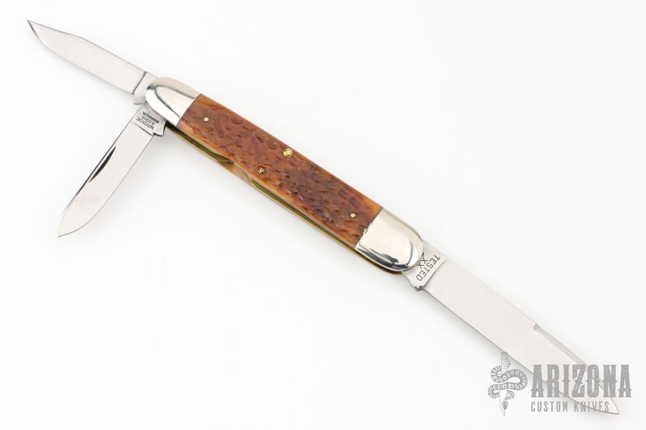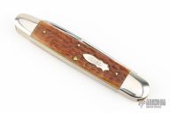 This Splitback Whittler by Case Knives features three mirror finished blades with nail nicks. The handle has nickel silver bolsters, jigged bone covers with a nickel silver escutcheon, brass liners and stainless steel springs. Comes with original box and papers. Excellent condition. 2900 were made.