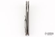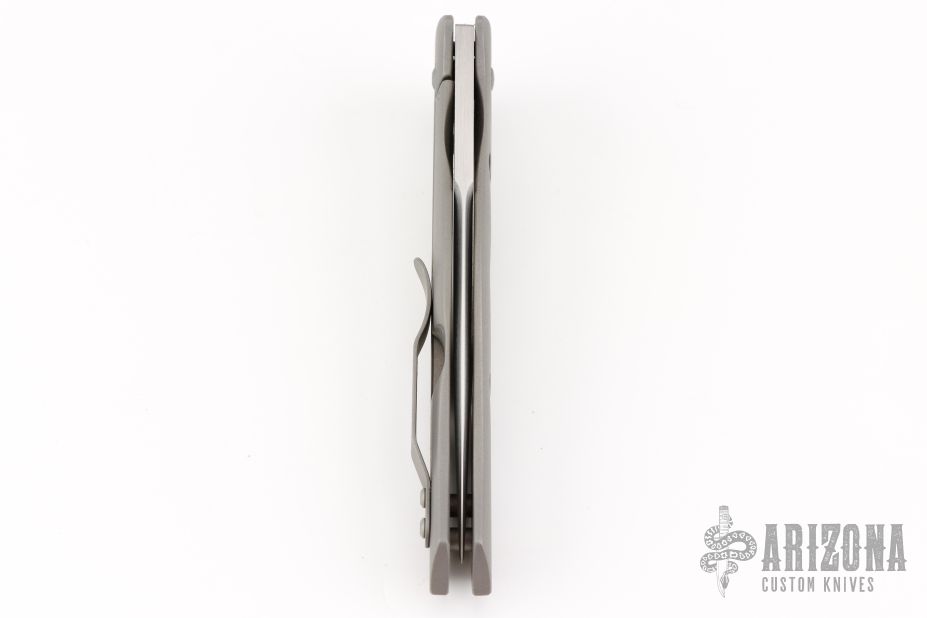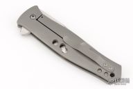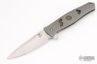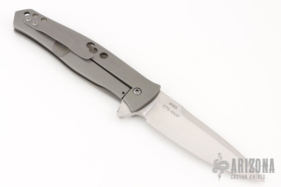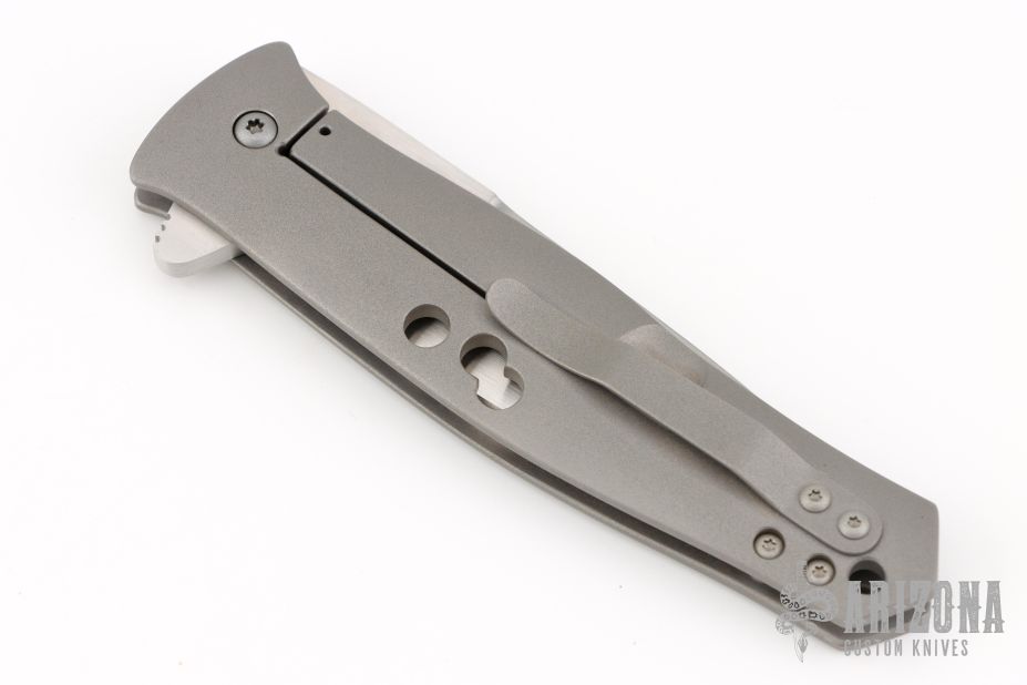 This Dr. Death is a flipper by Tom Mayo. The Dr. Death flipper has very smooth action on IKBS, nice detent, lockup and blade seating. Bead blasted titanium frame with MOA drilled hole accents and a "Federal 45 Auto" inlay, standoffs, lanyard hole, tip up titanium clip. The blade is hand rub satin finished with false top edge and flipper. Excellent condition. Comes with a zippered case.