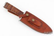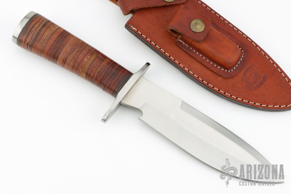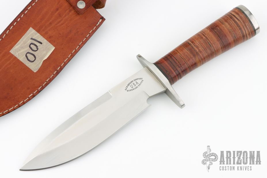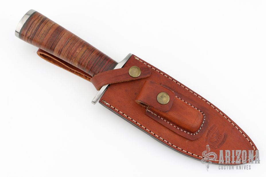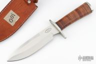 This knife by CFK Cutlery Company features a satin finished spear point blade with false top edge, .250" blade stock and 1.772" blade depth, hidden tang construction. The handle has a stainelss steel guard and butt with a stacked leather grip. Comes with a brown leather sheath. Has some light patina, otherwise excellent condition.