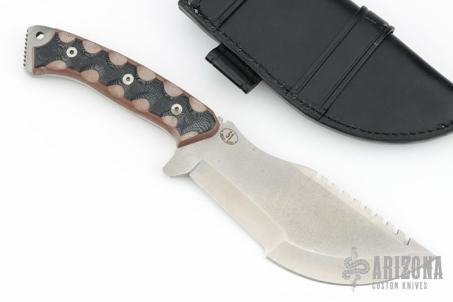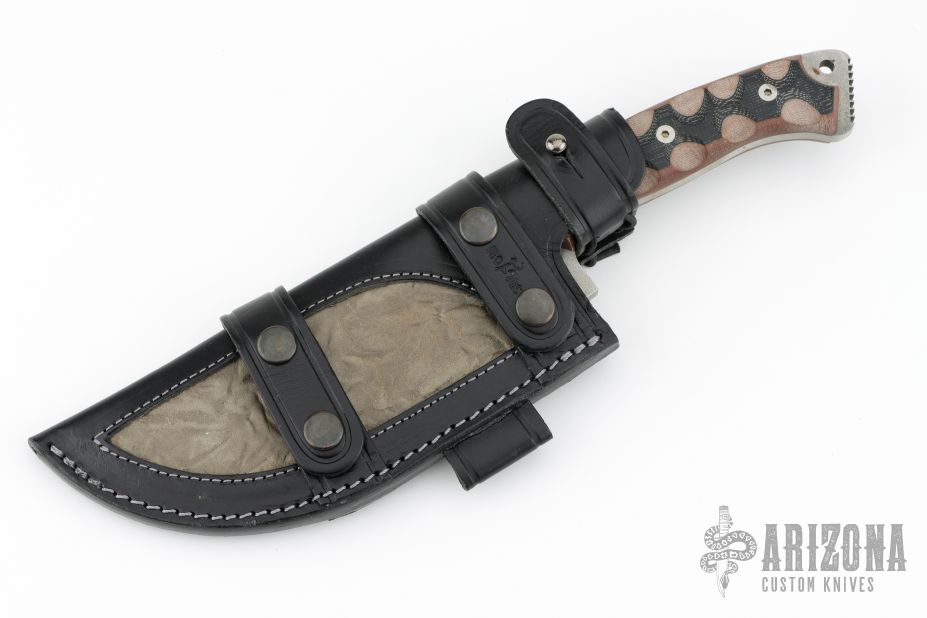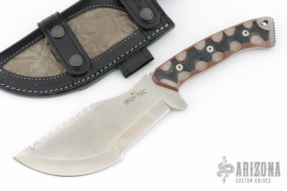 This Tracker by Jeo Tec features a Molybdenum-Vanadium (MOVA) blade with sawteeth on spine and a notched thumbrest, .222" blade stock and 2.477" blade depth, full tang construction. The handle has black canvas and brown linen micarta scales. Comes with a black leather sheath. Has some minor oxidation on the tang, otherwise excellent condition.