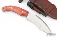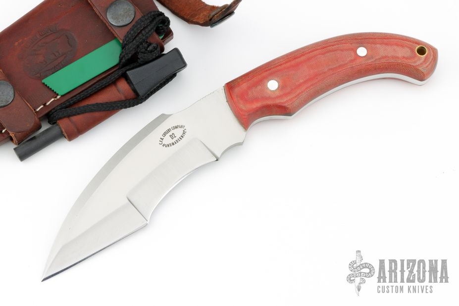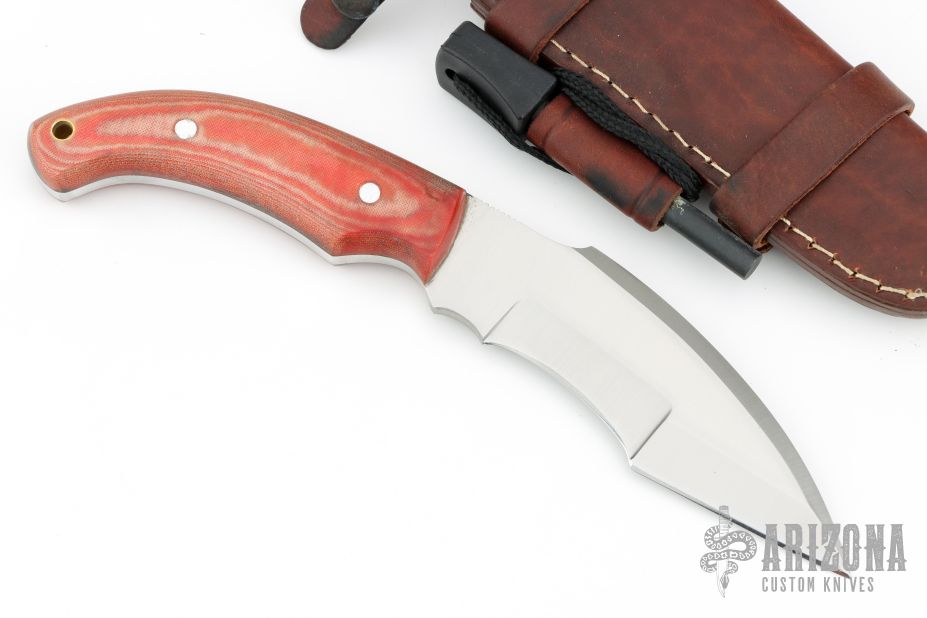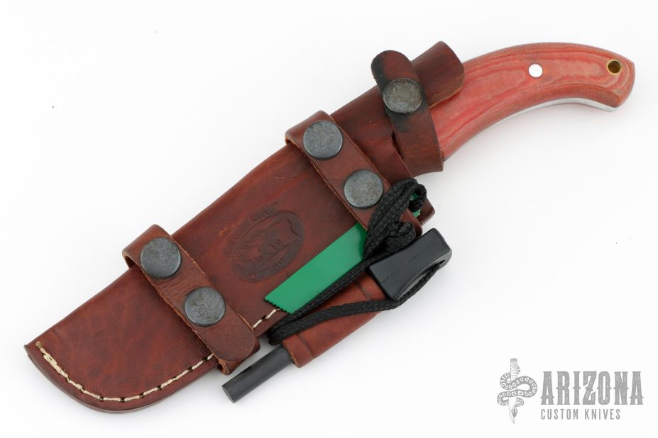 This Fighter by CFK Cutlery features a satin finished blade with false top edge and notched thumbrest, .207" blade stock and 1.492" blade depth, full tang construction. The handle has red linen micarta scales. Comes with a brown leather sheath with fire steel and striker. Excellent condition.