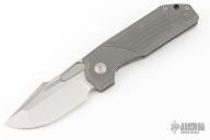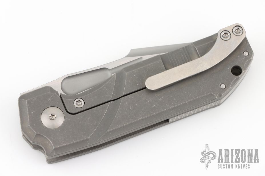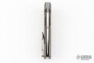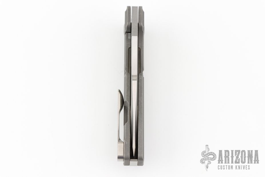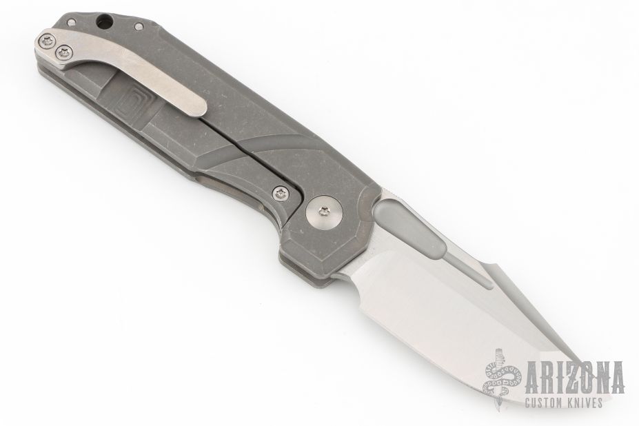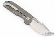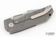 This SnappyBoi is a Jason Stout design, produced by Reate. It features a belt satin blade with thumbhole and notched thumbrest. The handle has a tumble/bead blast finish titanium frame, backspacer, and tip up clip. Has lock face insert. Comes with original box. Has a couple light scuffs, excellent condition otherwise.