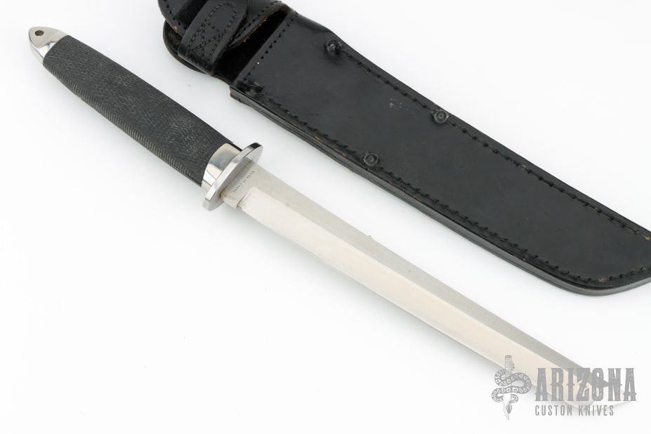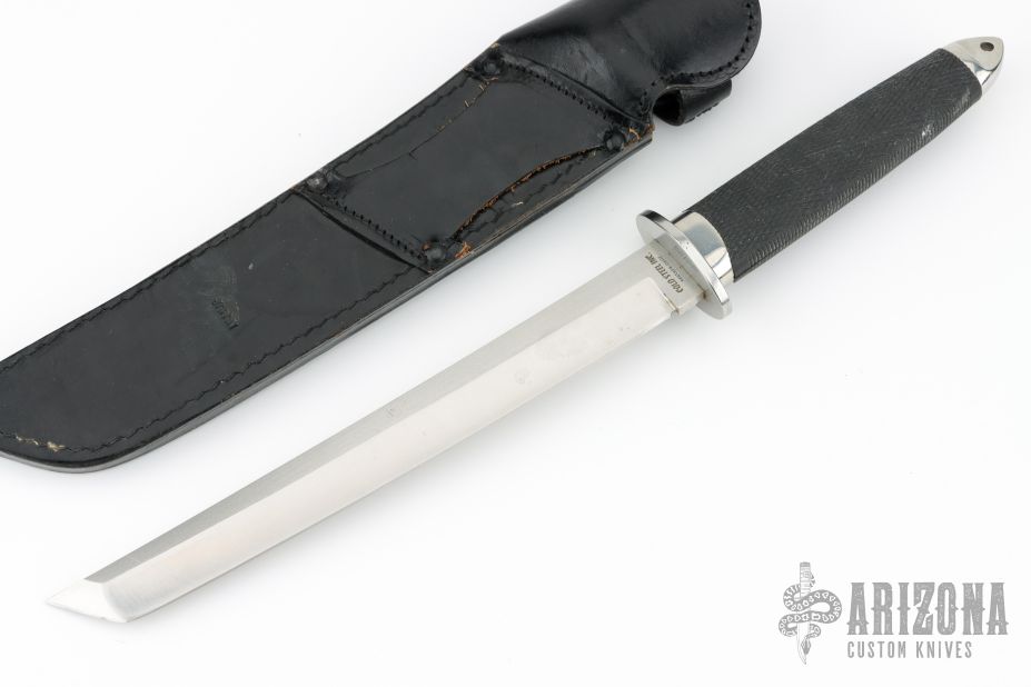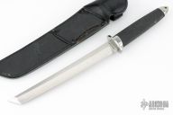 This original magnum tanto by Cold Steel features a satin finished tanto blade. Guard and pommel are stainless. .189" blade stock and 1.096" blade depth. Handle is textured Kraton for a sure non-slip grip. Comes with black leather sheath. Has a couple scratches, otherwise excellent condition.