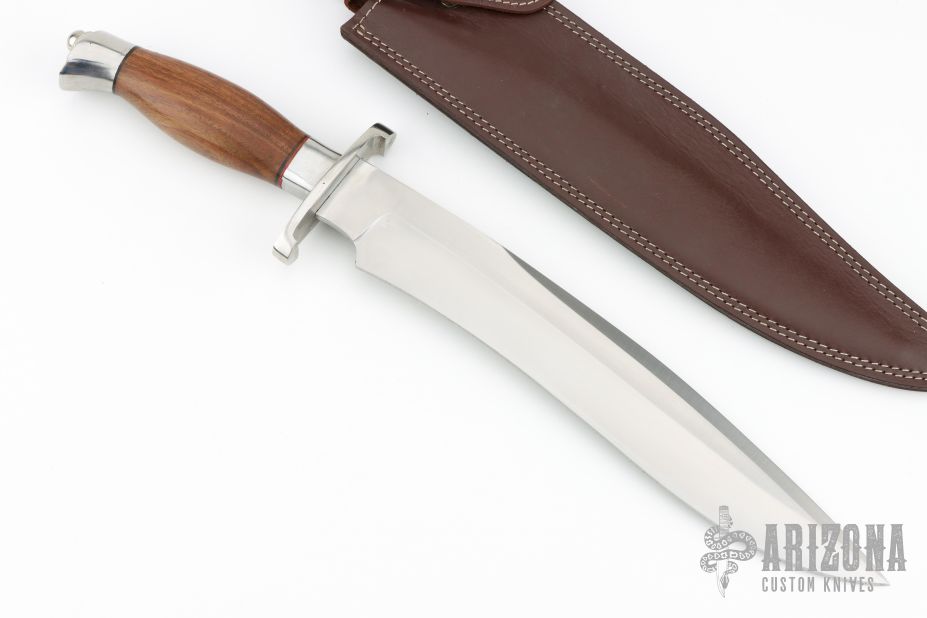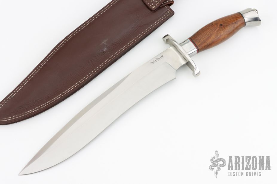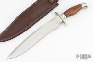 This Bowie by Andre Ronald features a satin finished recurve blade with false top edge, .175" blade stock and 1.866" blade depth, hidden tang construction. The handle has a steel guard and butt, walnut grip with red/black spacers. Comes with a brown leather sheath with belt loop. Has a couple light scratches, otherwise excellent condition.