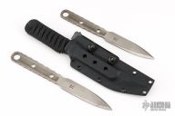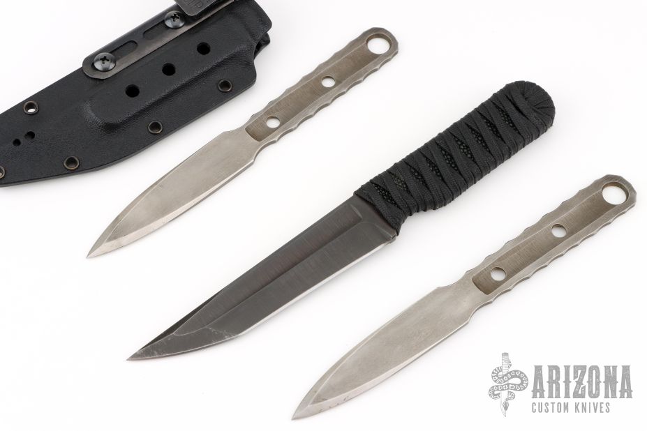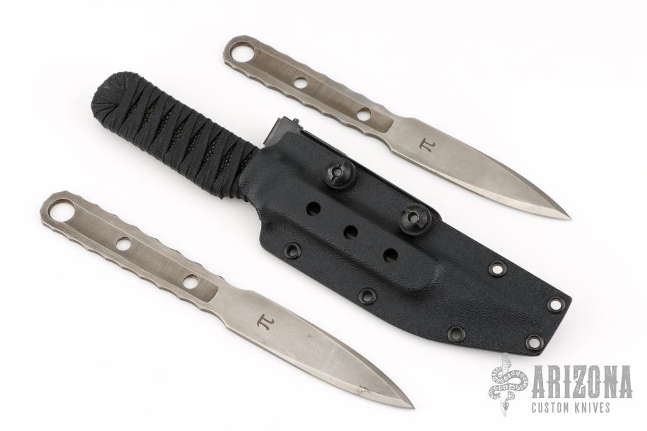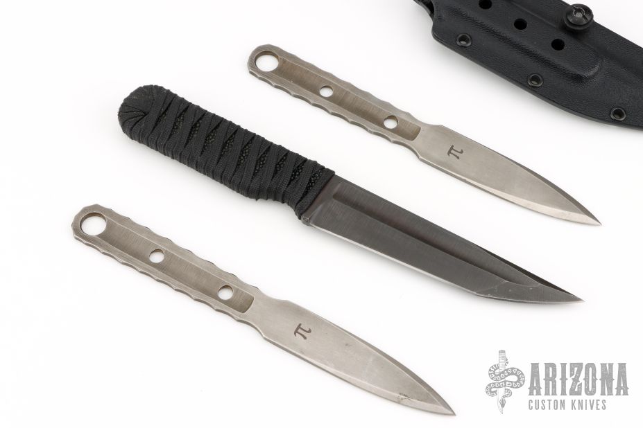 This knife features a tanto style blade with double fullers and a hidden tang construction.  .195" Blade Stock.  .987" Blade Depth.  The handle has a paracord wrapped grip over stingray underlay.  Includes a kydex sheath.  Includes a padded zippered case with 2 throwing knives. Excellent Condition.
