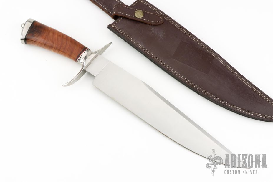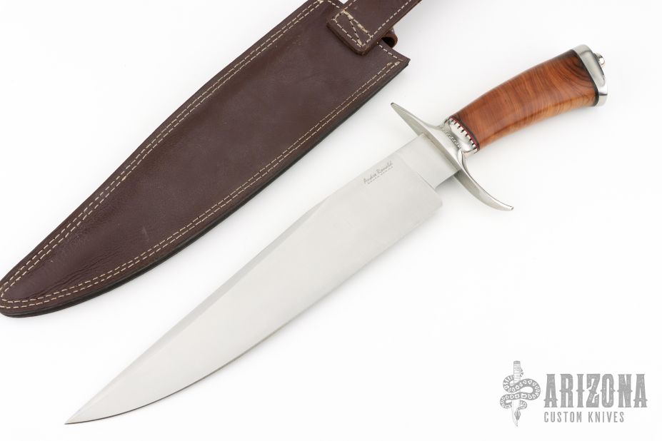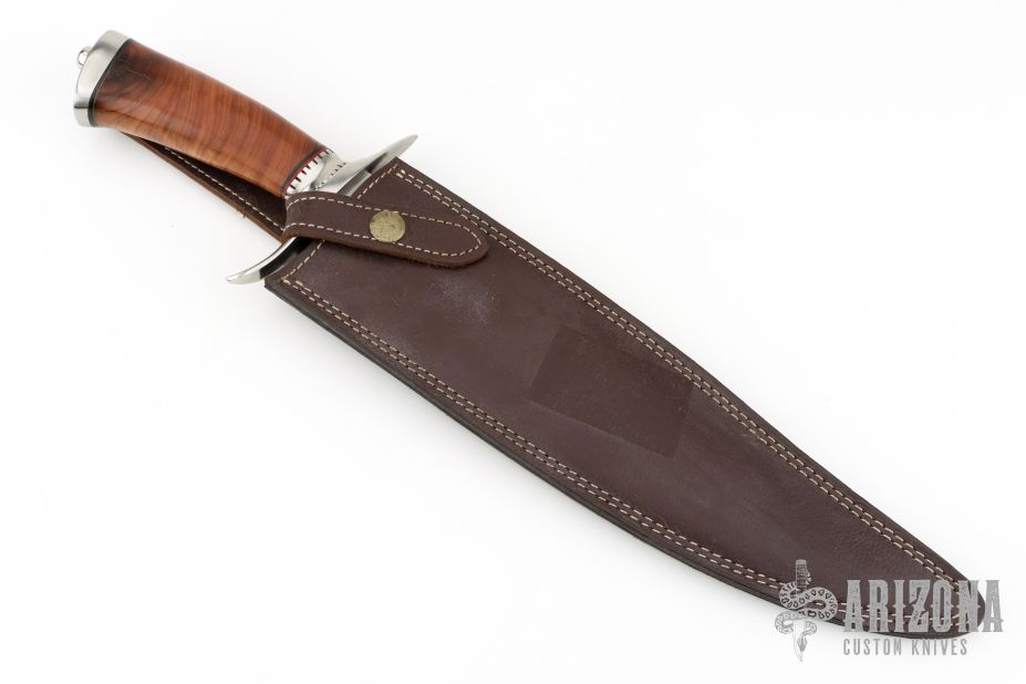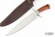 This Bowie by Andre Ronald features a satin finished clip point blade with false top edge, .182" blade stock and 2.020" blade depth, hidden tang construction. The handle has a steel guard and butt, walnut grip with red/black spacers. Comes with a brown leather sheath with belt loop. Has some light scratches, otherwise excellent condition.