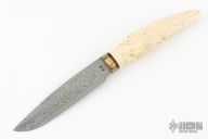 This knife by "P.B" (please let us know if you know who this maker is) features a Damasteel blade with false top edge, .125" blade stock and 1.311" blade depth, hidden tang construction. The handle has a brass guard, dragon carved mammoth ivory grip with black and red spacers. Comes with a zippered case. Excelelnt condition.