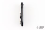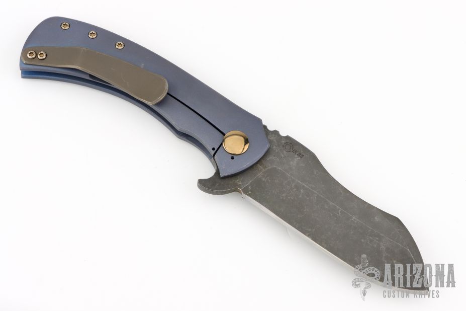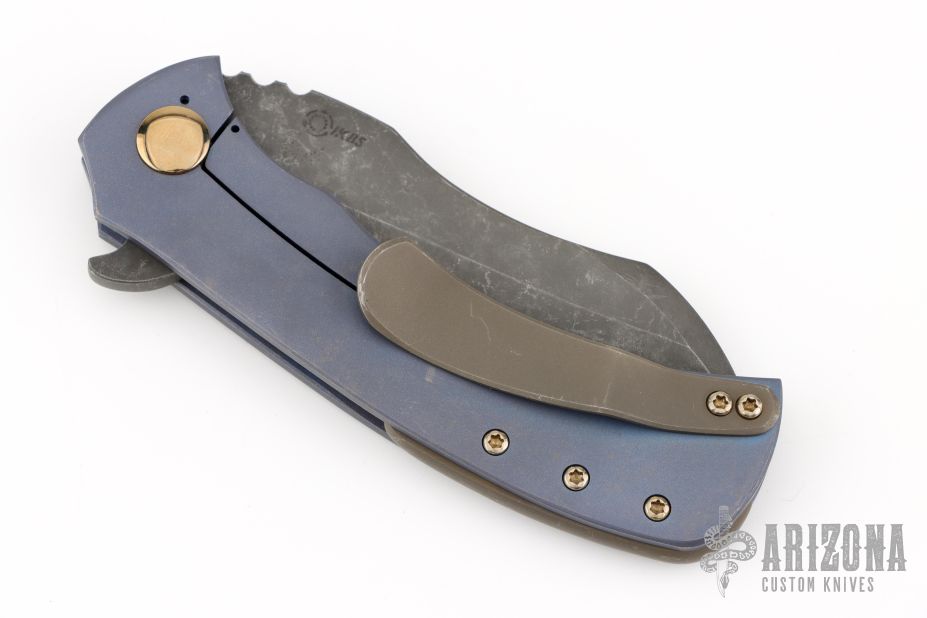 This Super Panda flipper by Doc Shiffer features a dark stonewashed blade with flipper and fileworked thumbrest. The handle has an anodized and tumble finished titanium frame with a titanium backspacer and tip up clip. Nice blade seating, detent and lockup. Features IKBS. Has some light scuffs, otherwise excellent condition.