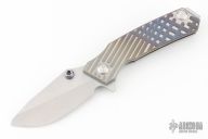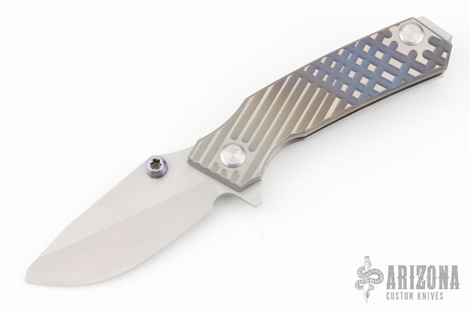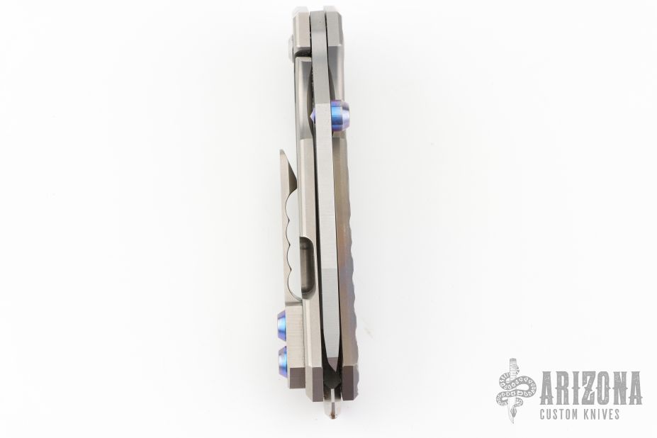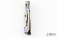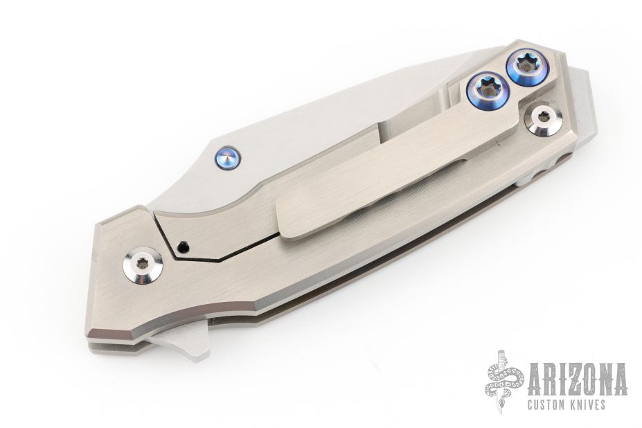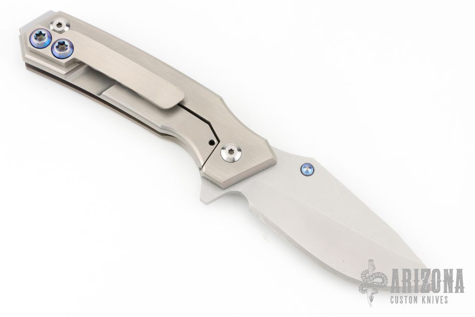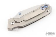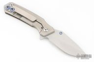 This Rogue Shark by Skike Knives features a matte finished blade with single thumbstud and flipper. The handle has a milled, anodized, and bead blasted titanium frame with a matching tip up clip, stainless steel floating backspacer. Nice detent, lockup and blade seating. Has some scuffs and scratches, great condition otherwise.