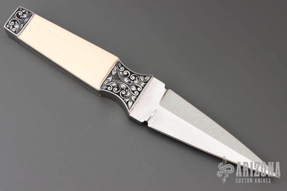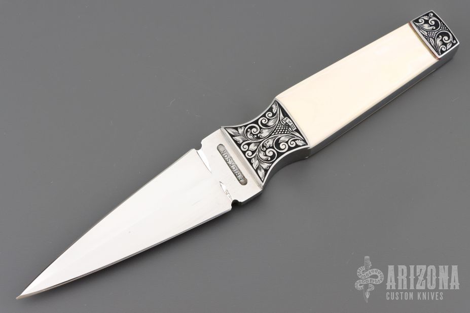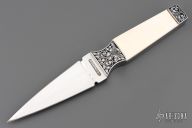 This dagger by Walter Erickson features a mirror polished double edged blade, .171" blade stock and 1.208" blade depth, full tang construction. The handle has dovetailed and engraved stainless steel bolsters with integral stainless steel liners and mammoth ivory inlays. One of the inlays has a very thin crack, you can just barely feel it with your fingernail. The bolster is engraved "I of VIII". Comes with a zippered case. Excellent condition.