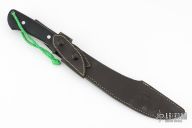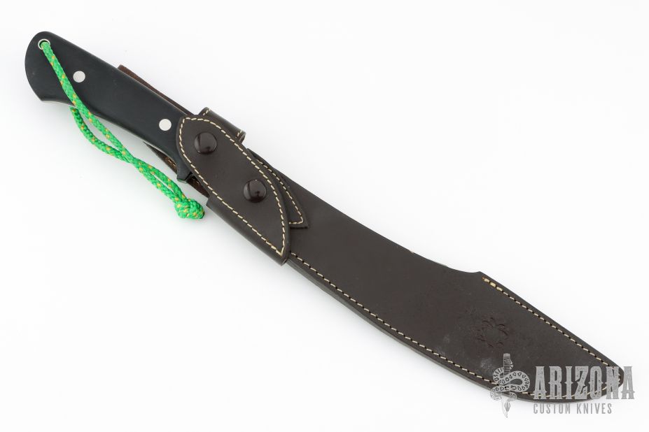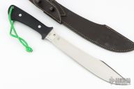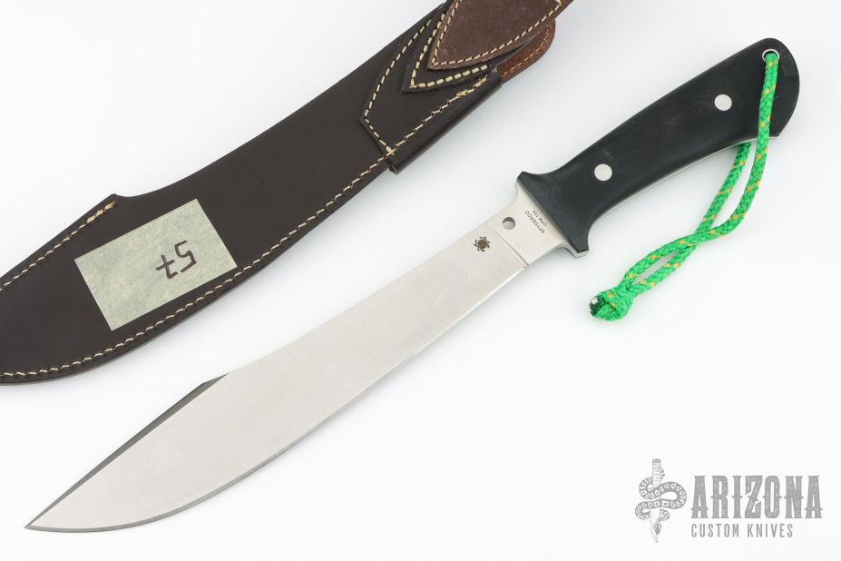 The Spyderco Darn Dao knife is based on a rare custom design by Bob Lum, and was inspired by the "single knife" broadsword of classic Chinese martial arts. This formidable fixed blade is equipped with a satin finished, full-flat ground CPM-154 stainless steel blade with an unsharpened swedge to offer a fine point. Its full tapered tang is fitted with contoured black G-10 scales that flare at the bottom for a positive grip. The Darn Dao is paired with a handcrafted leather sheath with a thumb-break-style snap to provide secure retention and a quick draw. The Darn Dao is a Spyderco "Flash Batch", which is similar to a Sprint Run, but features a brand new design not previously produced. Each knife in this Flash Batch is individually numbered. This is a one-time-only production run. This knife is #0981 of 1200. Comes with original leather. Excellent condition.