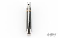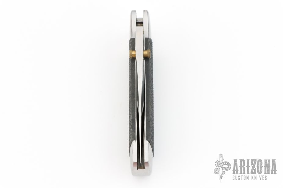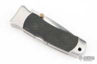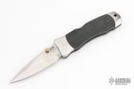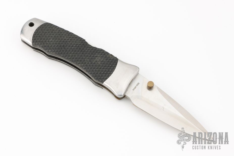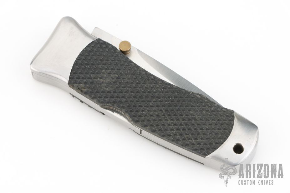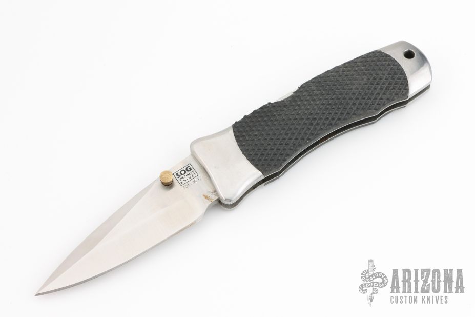 This Vintage lock back by SOG features a satin finish blade with false top edge and dual thumbstuds. The handle has satin finished stainless steel bolsters, liners and backspacer, checkered rubber scales, custom fitted tip down stainless steel clip. Strong lock up. Has some light scratches, otherwise good condition.