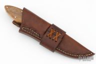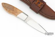 This Hunter by Shulyer Lovestrand features a spear point blade with satin finish flats and mirror polish grinds, .165" blade stock, .972" blade depth, full tapered tang construction. The handle has mirror polish dovetailed stainless steel bolsters and mammoth ivory scales. Comes with a handle tooled brown leather sheath. Excellent condition.