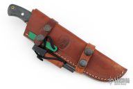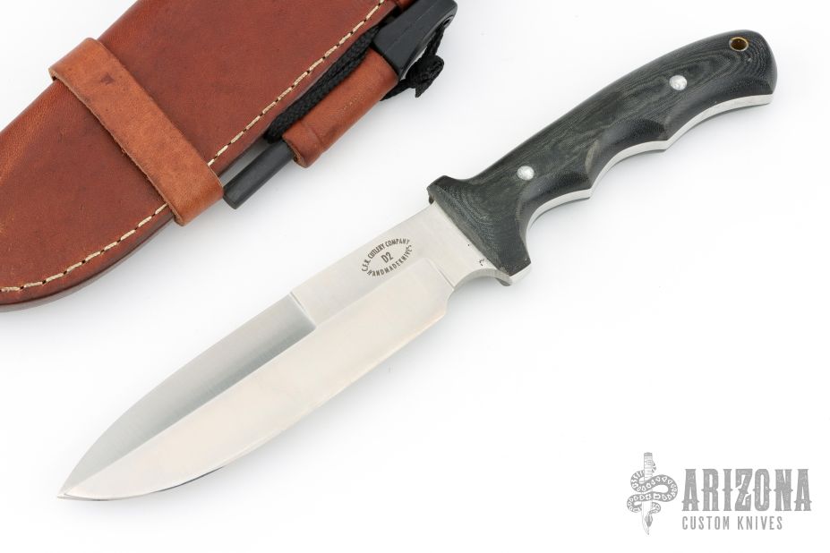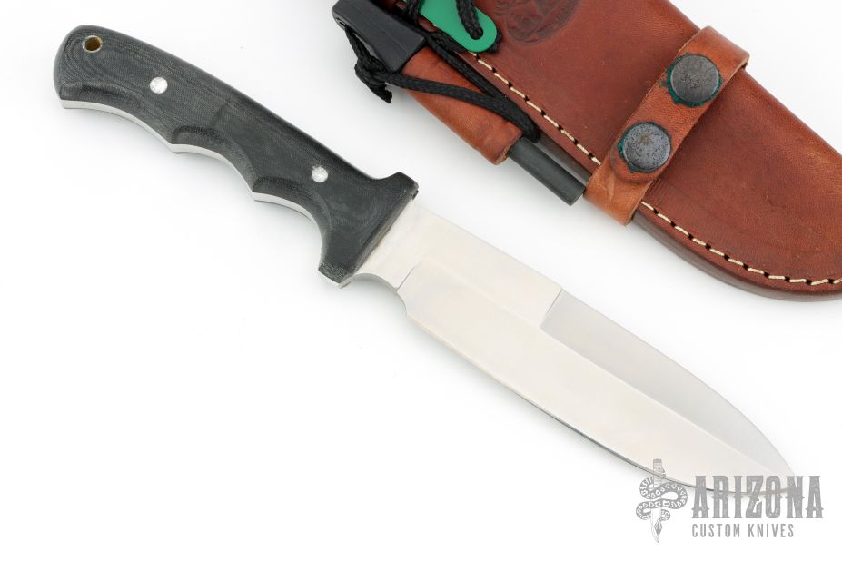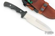 This Fighter by CFK Cutlery features a satin finished blade with false top edge, .211" blade stock and 1.438" blade depth, full tang construction. The handle has black linen micarta scales. Comes with a brown leather sheath with fire steel and striker. Excellent condition.