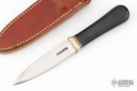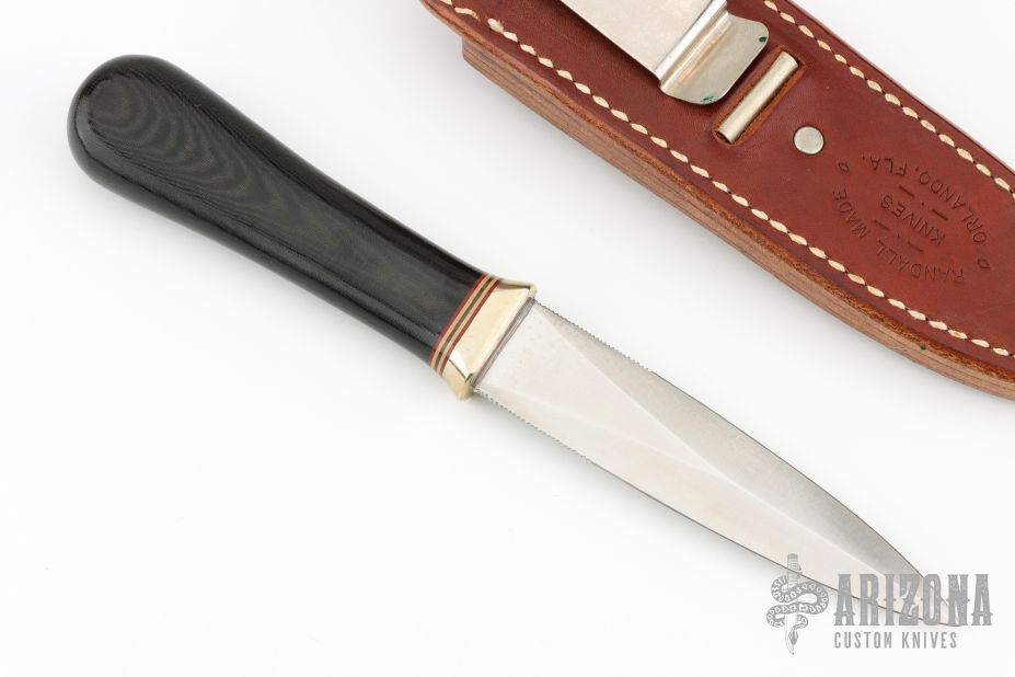 This Model 24 Guardian by Randall Made Knives features a satin finished double-edged blade with notched finger rests, .109" blade stock and .866" blade depth, hidden tang construction. Black linen micarta grip with red/white/blue spacers and a nickel silver guard. Both edges of the blade are sharpened with 1" of thumb notches. This model was designed in 1978 for use by police, undercover agents and law enforcement personnel for self-protection and as a back-up weapon. Comes with a brown leather sheath w/ boot clip. Excellent condition.
