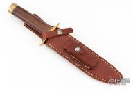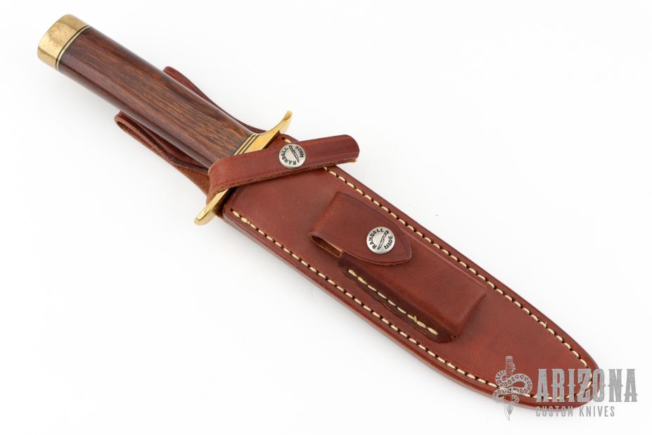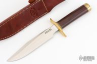 This Model 1-7 from Randall Made Knives features a satin finished clip point blade with sharpened top edge, .198" blade stock and 1.209" blade depth, hidden tang construction. The handle has a brass guard and butt, black/brass spacers, and a desert ironwood grip. Comes with brown leather sheath. Excellent condition.