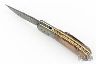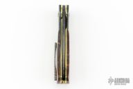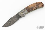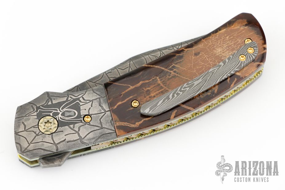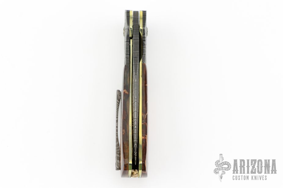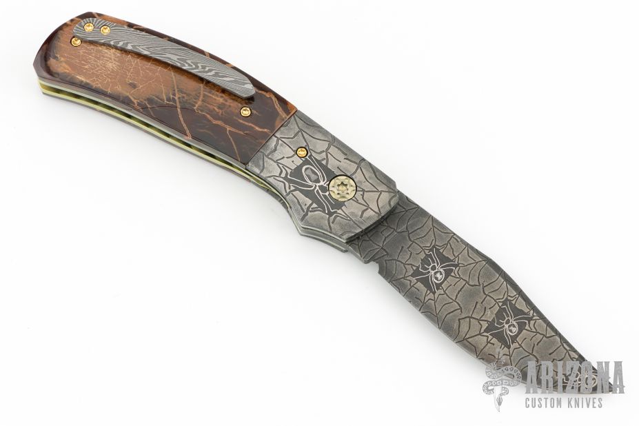 This linerlock folder by Mike Tyre features a "Black Widow" Damascus blade with false top edge and a flipper tab. The handle has matching Damascus bolsters, mammoth ivory scales, fileworked and anodized titanium liners, rope fileworked carbon steel backspacer that has been nitro blued gold to match the liners, 18k gold screws, tip up Damascus clip. Nice detent, lockup and blade seating. Rides on caged bearings. Comes in a zipper case and COA dated March 3, 2021. Excellent condition. Comes with a note from the maker with specifics about the composition and construction of the Damascus. Won Best knife in show and Best folder in show at the California Blade Show 2023!
