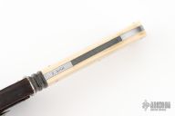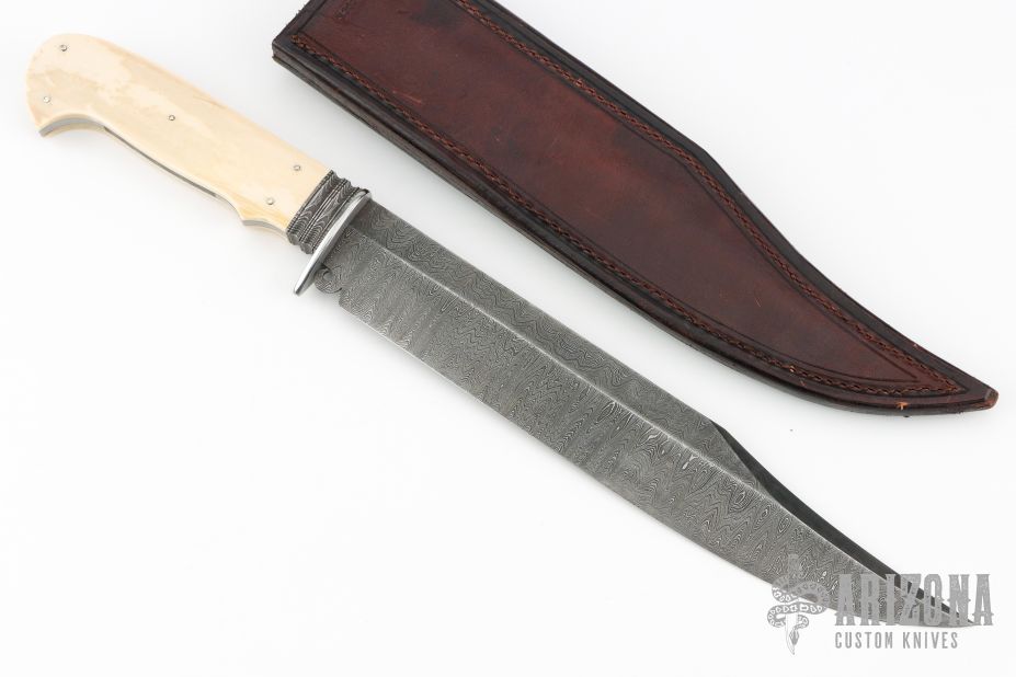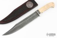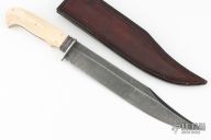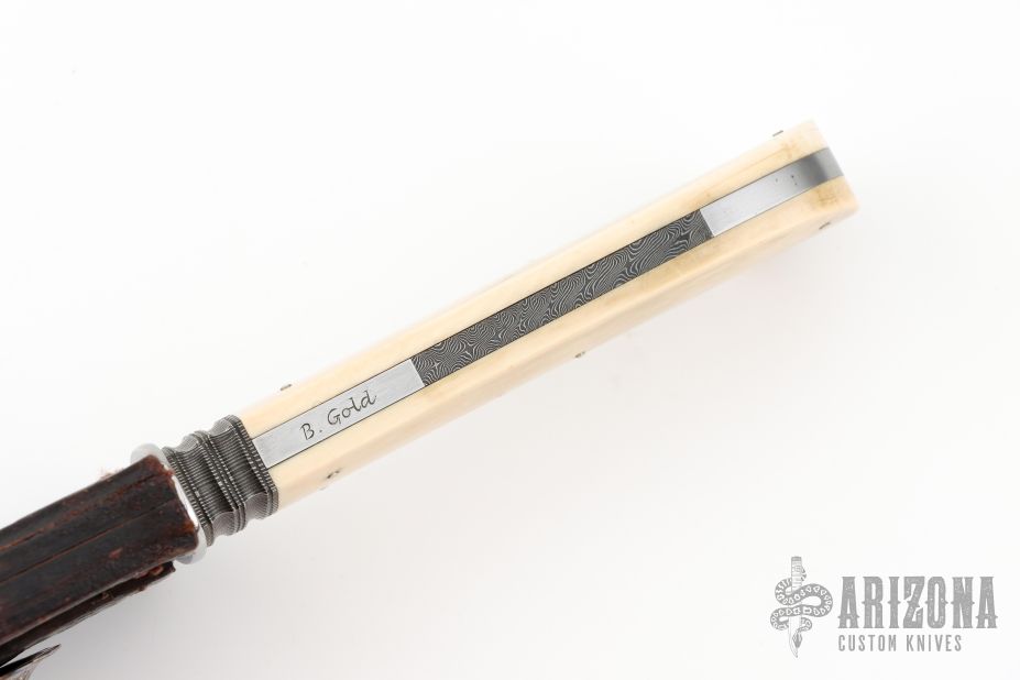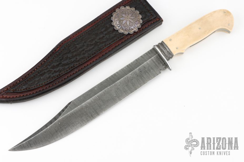 This Southwest Bowie by Master Smith Tim Hancock has a Damascus blade with false top edge and a Spanish notch, .256" blade stock and 1.522" blade depth, hidden/frame tang construction. The handle has a polished stainless steel guard, fluted Damascus collar, mammoth ivory scales over a Damascus and stainless steel frame, nickel silver pins. Comes with a brown leather sheath with an elephant hide panel and a sterling silver concho. The scales have some naturally occuring cracks, but the material is perfectly stable, excellent condition. Comes with a zippered case. On page 86 of "Tim Hancock the Western Bladesmith"