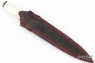 This Dagger by Master Smtih Tim Hancock features a double edged Damascus blade with .170" blade stock and 1.009" blade depth, hidden tang construction. The handle has a Damascus guard, fluted Damascus collar and butt, fossil walrus ivory grip, Damascus finial. Comes with a brown leather sheath with an elephant hide panel. Comes with a zippered case. Excellent condition. We were told this was the last knife that Tim Hancock made.