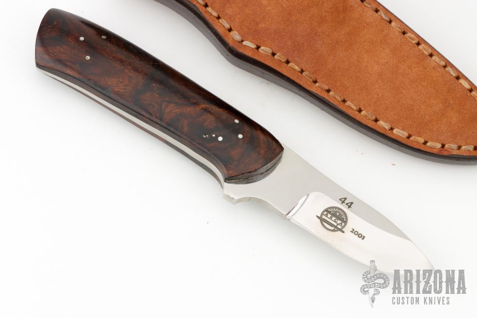 This knife by Jim Yarbrough features a mirror finish blade with .159" blade stock and .899" blade depth, full tapered tang construction. The handle has desert ironwood burl scales. Comes with a brown leather sheath. The scales have a couple naturally occuring inclusions, otherwise excellent condition.