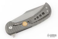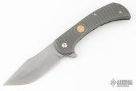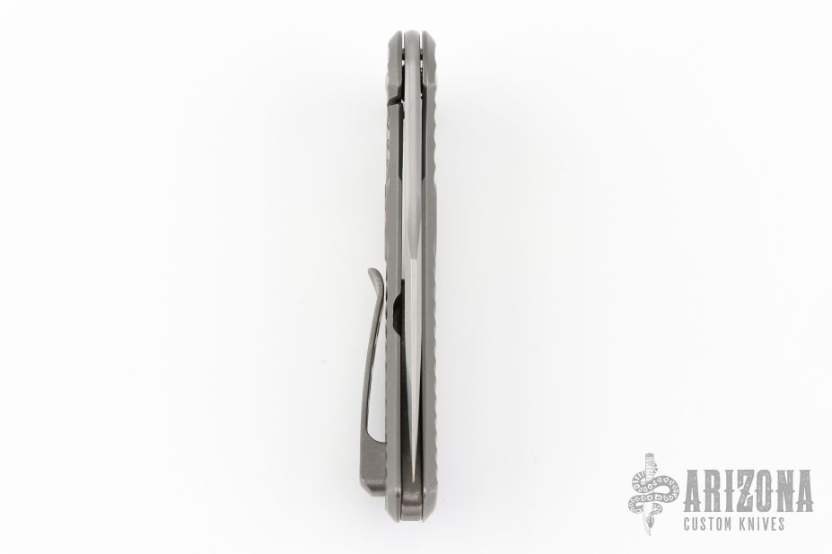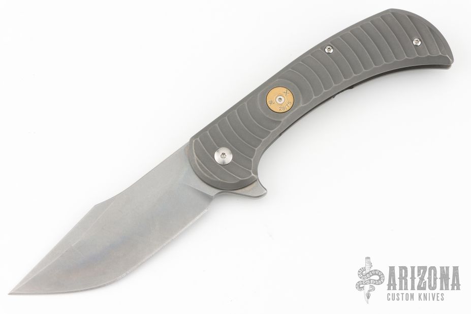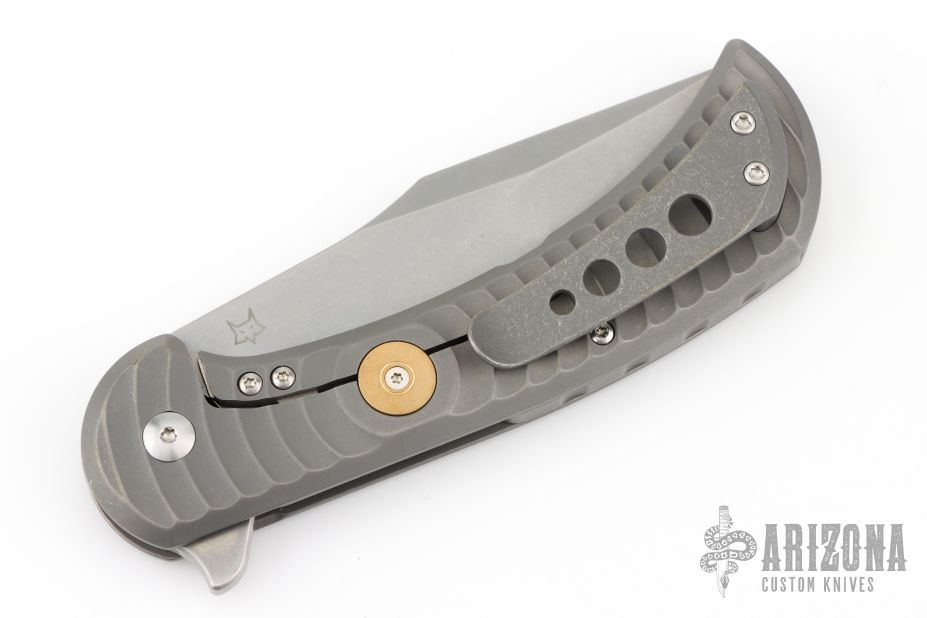 This "Bullet" by Fox Knives is a Gudy Van Poppel design and features a clip point tumble finished M390 blade with false top edge and flipper. The handle has a milled titanium frame with stainless lockface insert, built in lockbar stabilizer and a matching titanium tip up clip. Nice detent, lockup and blade seating, rides on bearings. Comes in deluxe leather Fox Knives pouch with tool and papers. Has some light scuffs, excellent condition.
