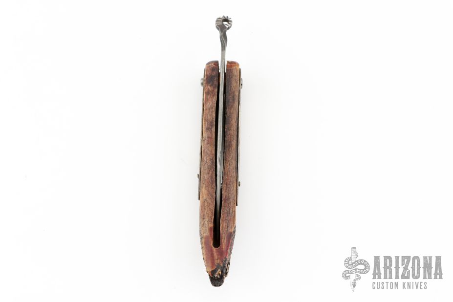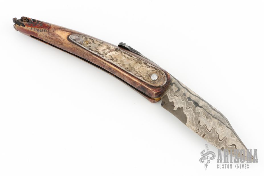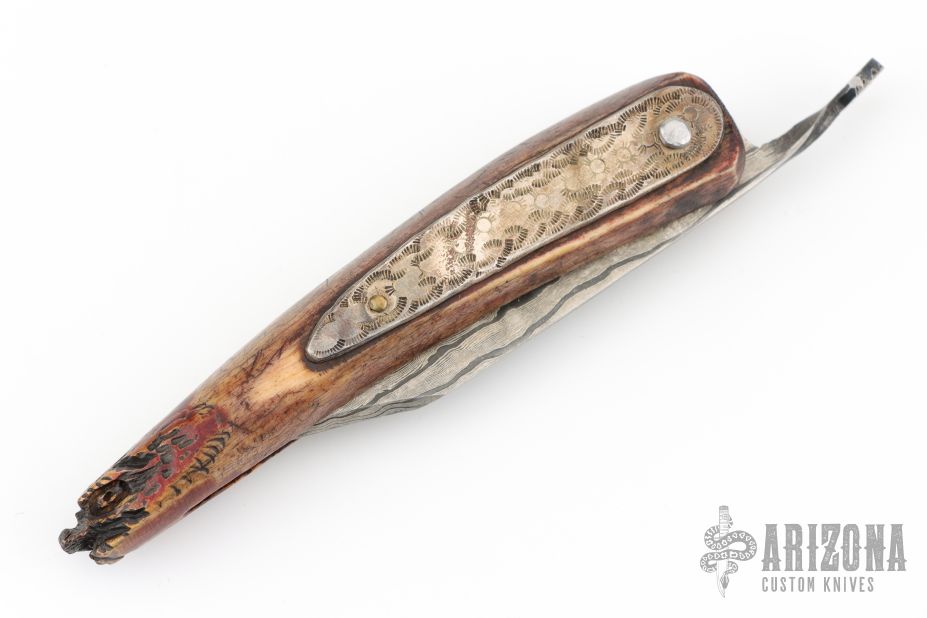 This Friction Folder by Master Smith Raymond Rybar features a Damascus blade. The handle is a piece of stag with stamped silver overlays and a falcon's head carved butt. Excellent condition. This piece is not marked with a makers mark. The consignor said it was made by Raymond Rybar.