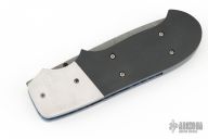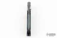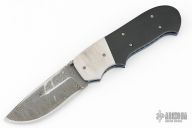 This Linerlock by Stamascus features a Damascus blade with single checkered thumbstud. The handle has stainless steel bolsters, black G-10 scales, anodized titanium liners and a San Mai Damascus backspacer. Has nice lockup and detent. Has scratches, has been resharpened poorly and the grinder sanded down some of the flats, has been used and carried, poor condition.