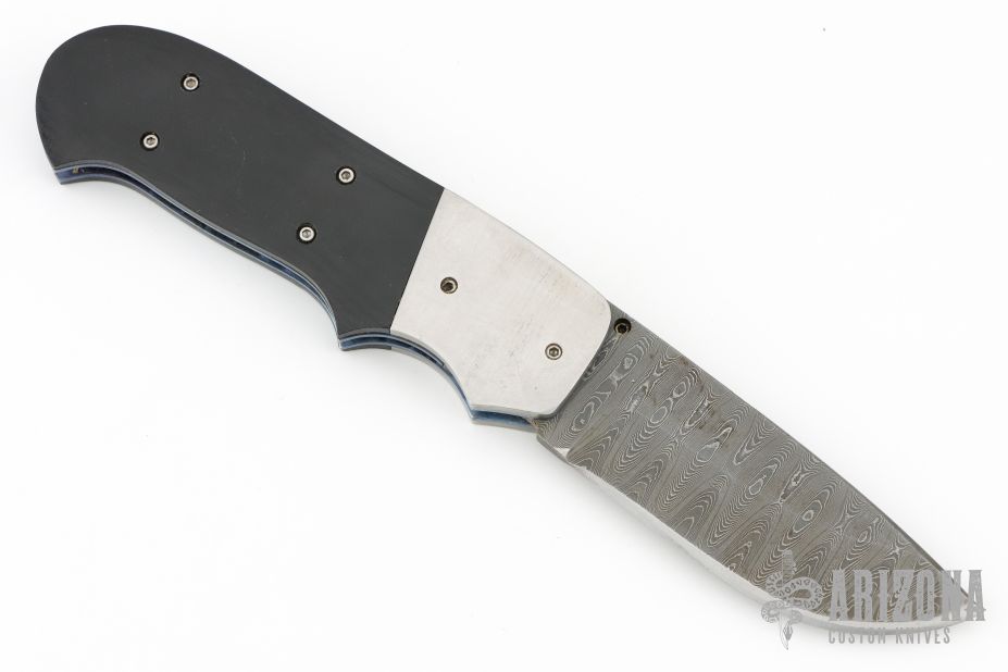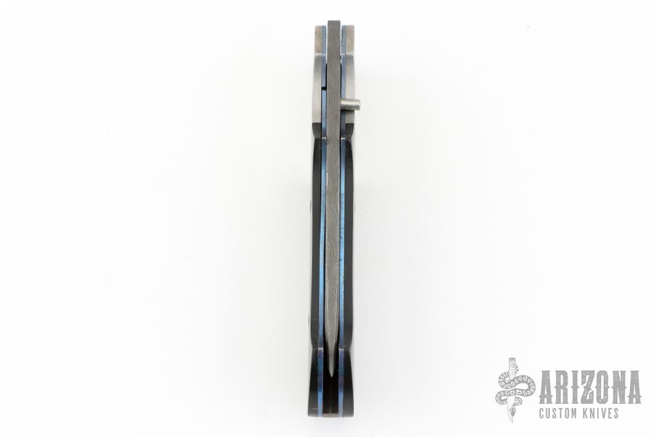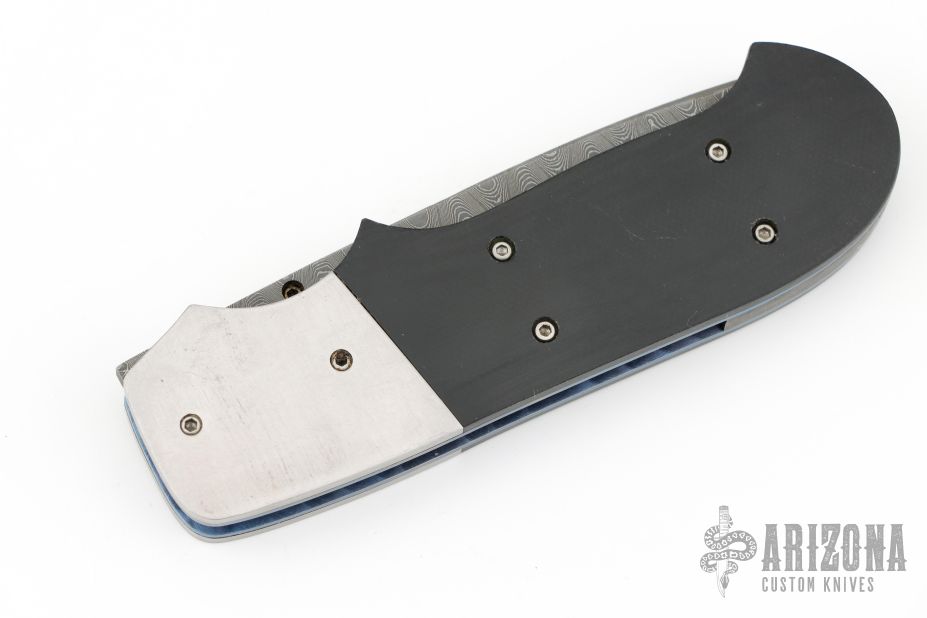 This Linerlock by Stamascus features a Damascus blade with single checkered thumbstud. The handle has stainless steel bolsters, black G-10 scales, anodized titanium liners and a San Mai Damascus backspacer. Has nice lockup and detent. Has scratches, has been resharpened poorly and the grinder sanded down some of the flats, has been used and carried, poor condition.