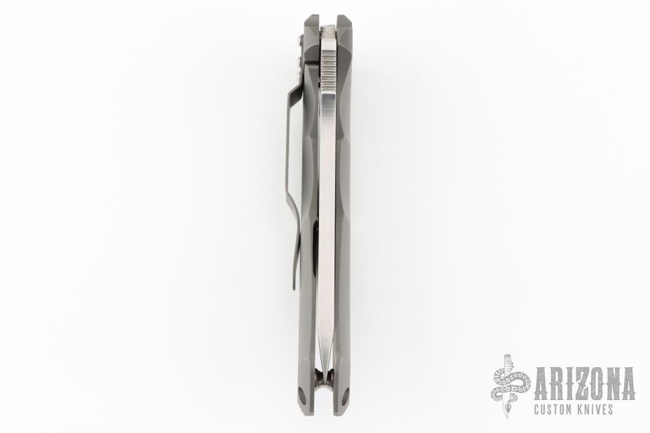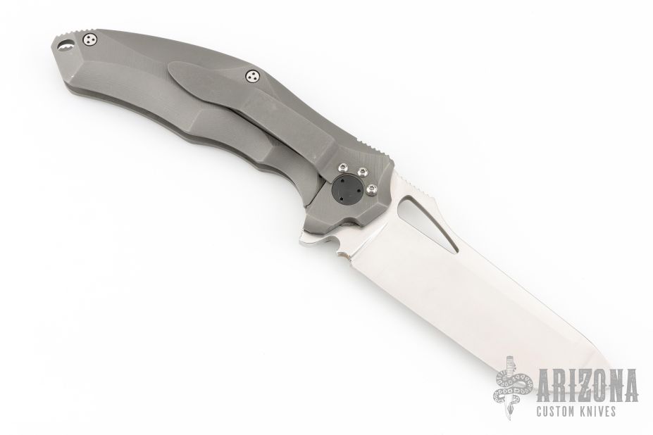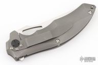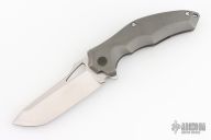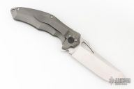This Darkstalker from Messerkonig features a satin finished clip point blade with thumb hole, notched thumb ramp and flipper. The handle is comprised of bead blasted titanium scales over titanium barrel spacers. Lanyard hole in pommel. Comes in a zipper case. Has scuffs and scratches throghout. Good condition; great user condition otherwise.