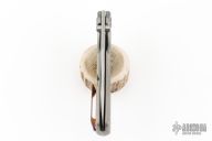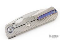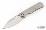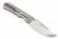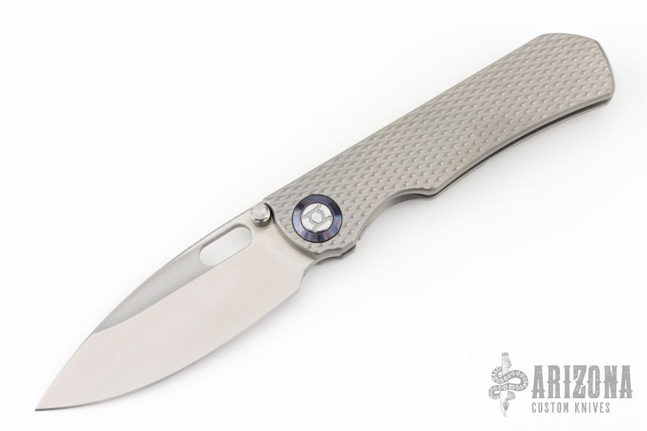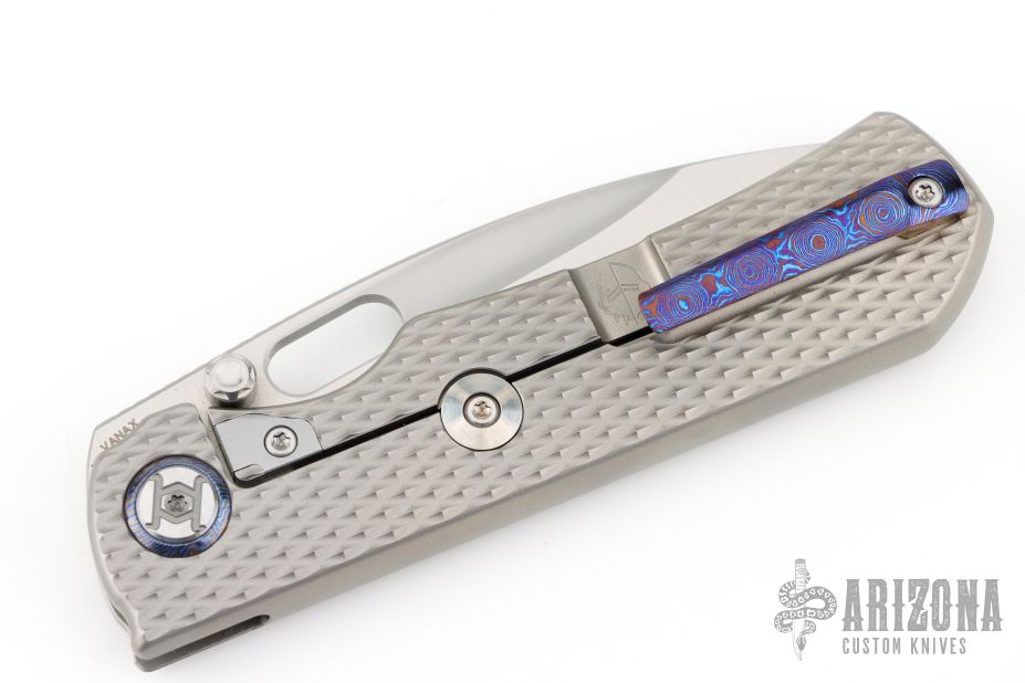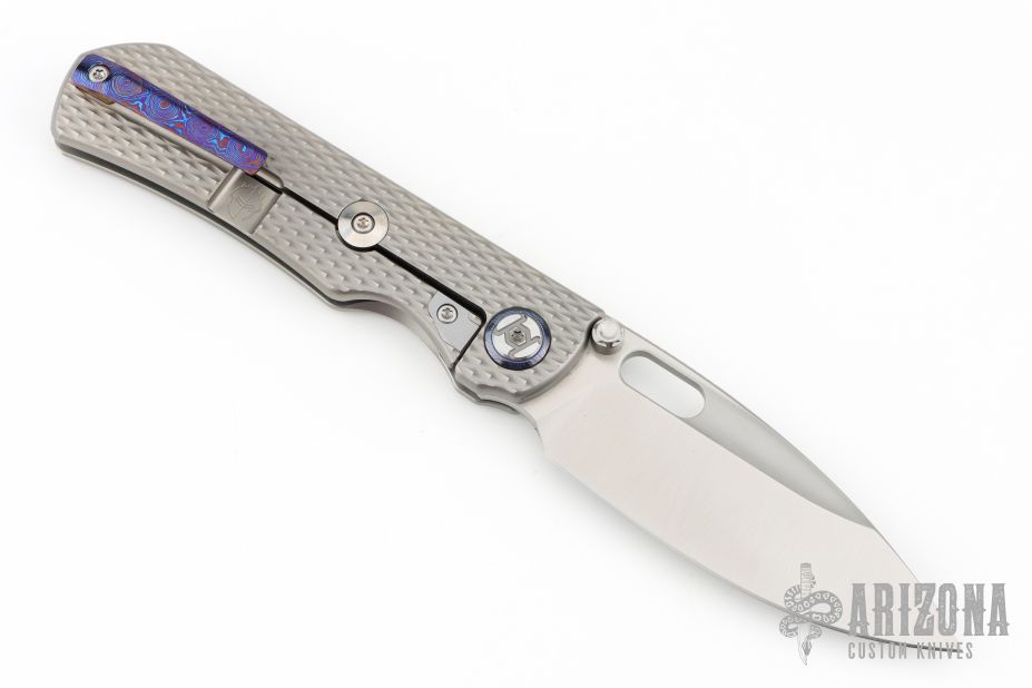 This knife by Kunwu Knives features a satin finished blade with notched thumbrest and flipper. The handle has a textured titanium integral frame, mokuti pivot collar and tip up clip. Comes with original box, extra hardware and papers. Vanex blade steel. New condition, I had to remove the shrink wrap on the box to write up the knife.