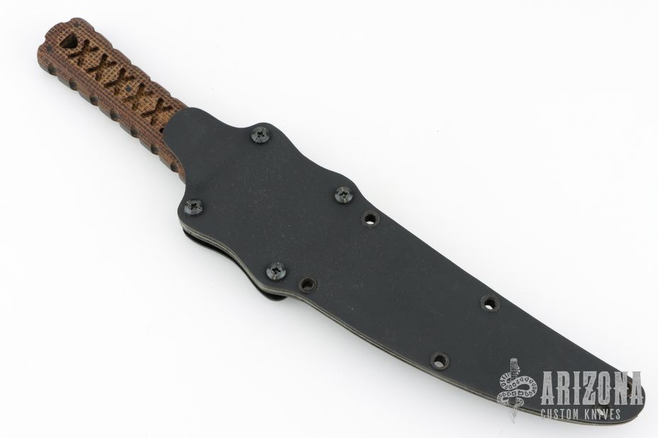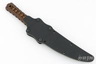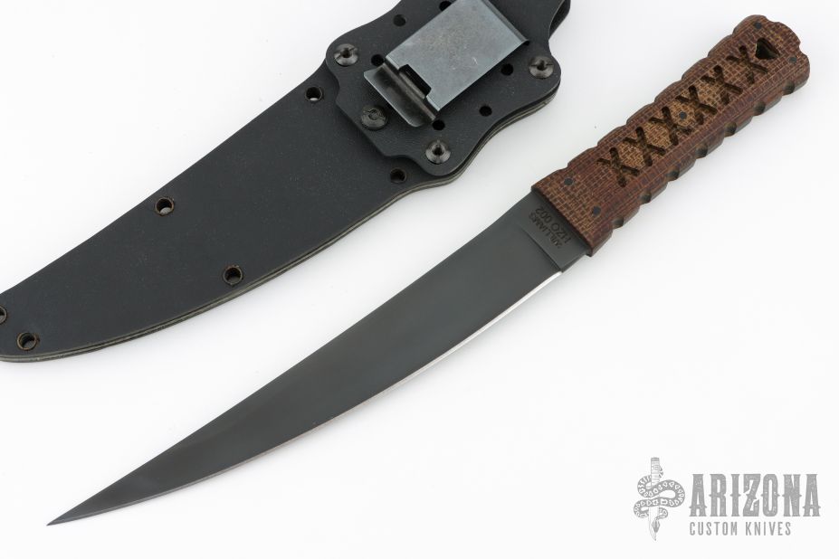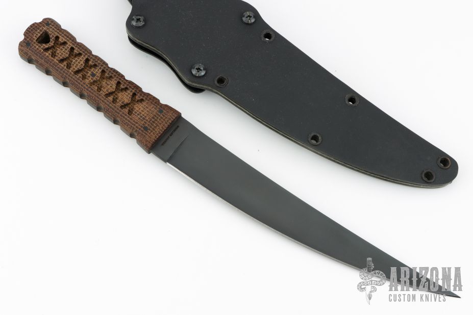 This William Blade Design HZO fixed blade by Winkler II Knives features a black blade with .203" blade stock and 1.324" blade depth, full tang construction. The handle has brown burlap micarta scales with lanyard hole. Comes with original box, papers and black kydex sheath. Excellent condition.
