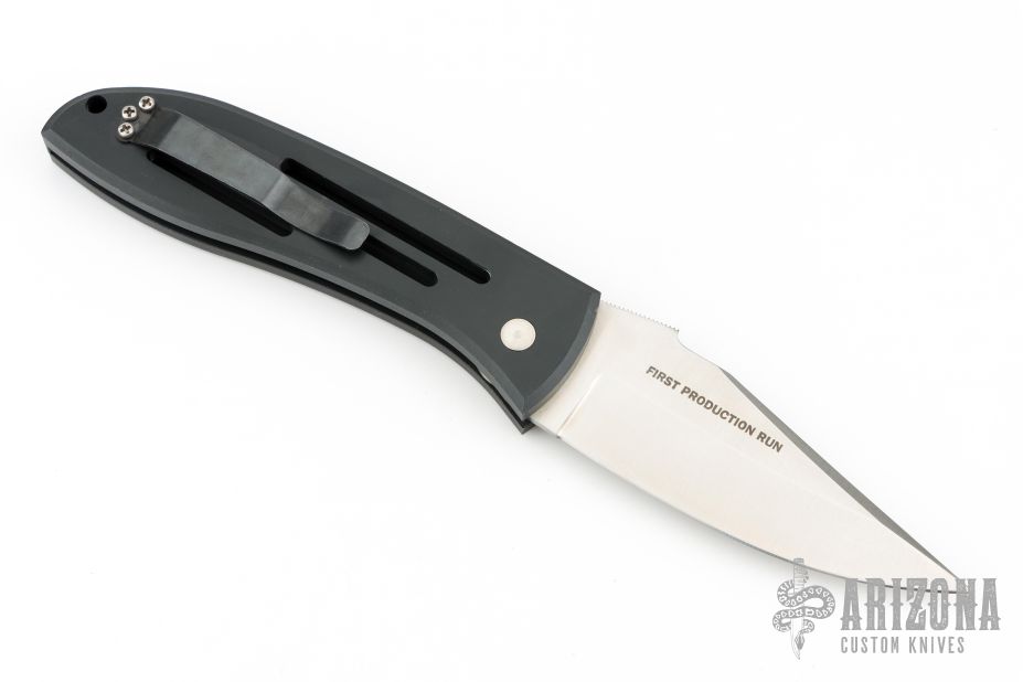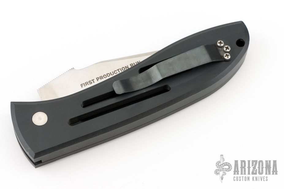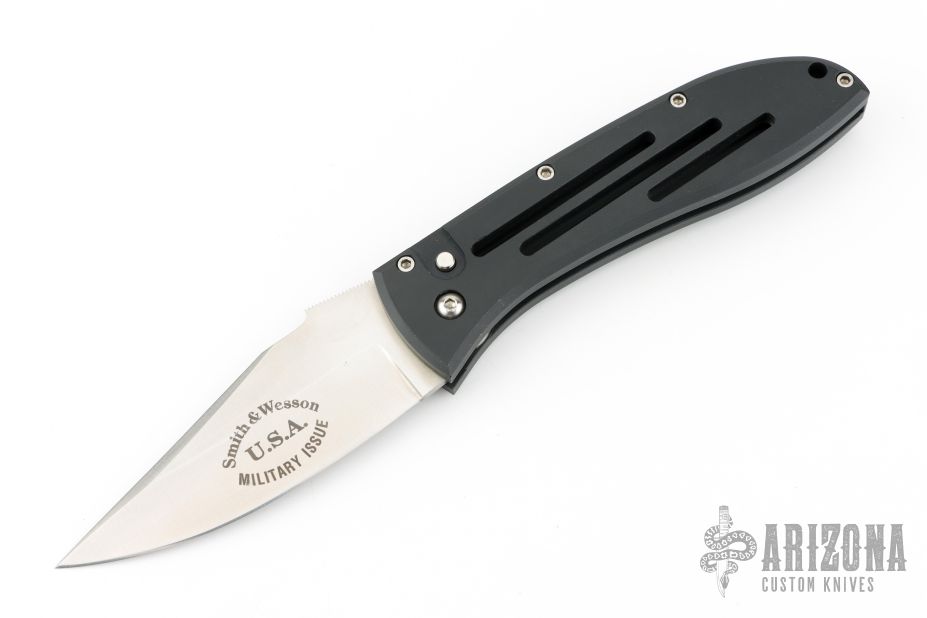 This Military Auto by Smith & Wesson is from the First Production Run. It features a satin finished blade with notched thumbrest. The handle has a black aluminum frame with tip up black stainless steel clip, lanyard hole. Excellent condition.