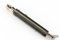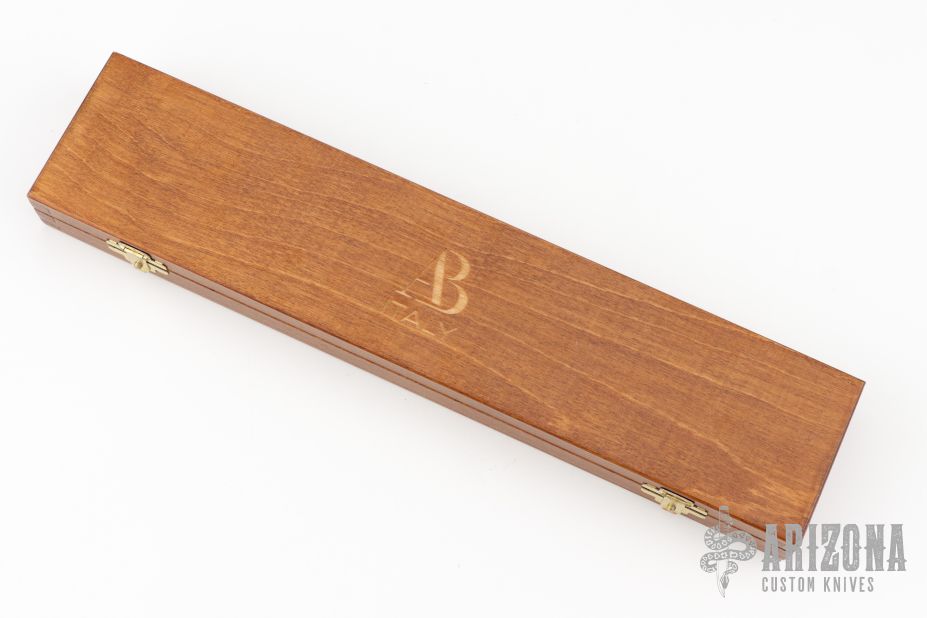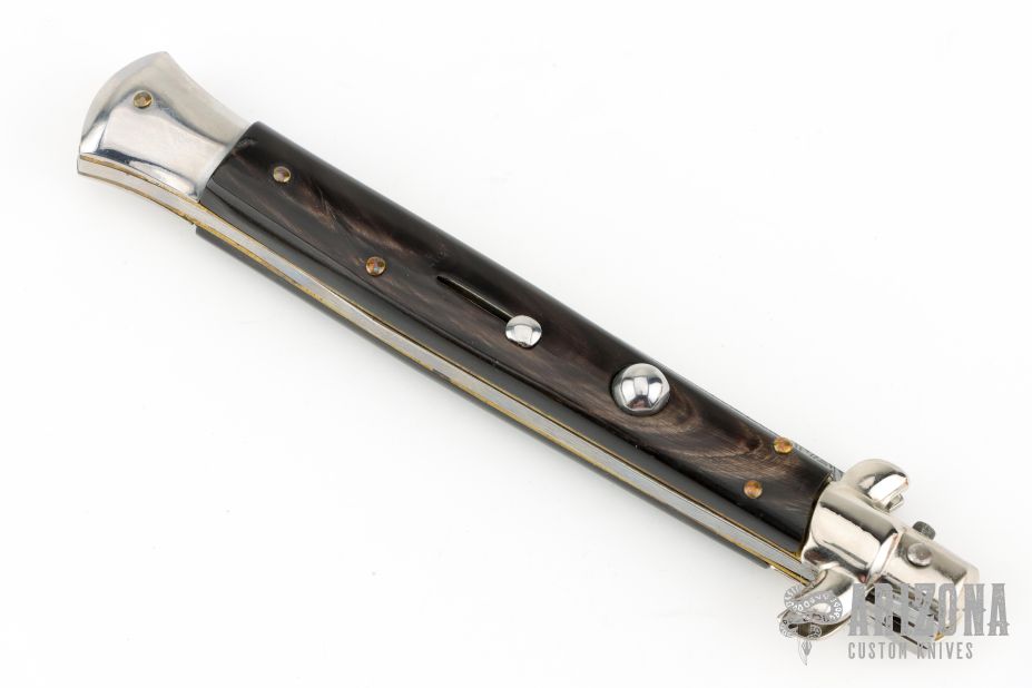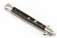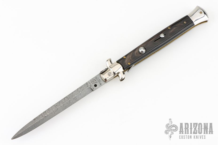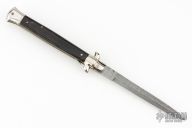 This Swivel Bolster Auto by Armando Beltrame features a Damascus blade with a dagger style blade with a false top edge. The handle has nickel silver bolsters, buffalo horn scales with brass liners, stainless steel backspacer. Comes with a wooden presentation box. Has some light oxidation spots on the blade, otherwise excellent condition.