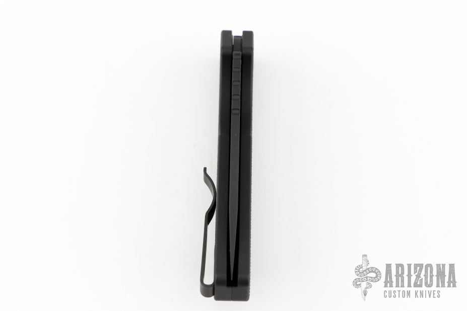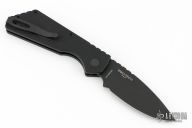 This Pro-Strider PT by Pro-Tech and Strider Knives features a black blade with notched thumbrest. The handle has a black textured aluminum frame with black hardware and black stainless steel tip up clip. Comes with original box and papers. New condition.