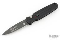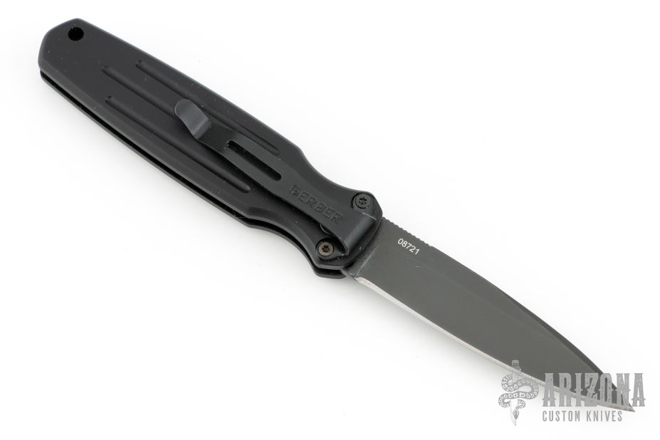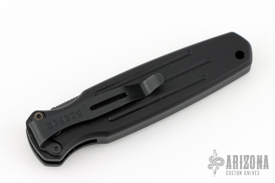 This Mini Covert Auto by Gerber features a black spear-point blade a notched thumbrest. Has a black aluminum handle with a and safety. Black stainless steel clip, tip down clip. Excellent condition. Comes with original box and papers.  Discontinued