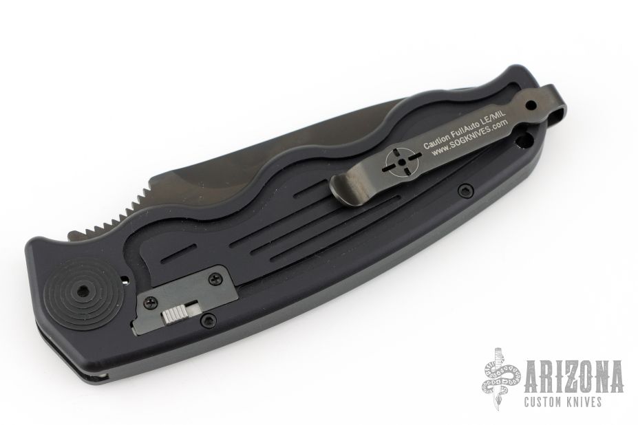 This SOG-TAC Auto has a black finish blade with notched thumb rest. Handle is black anodized aluminum with safety, lanyard hole, and stainless steel tip up clip - RH/ LH reversible. Comes with original box and papers. Excellent condition.