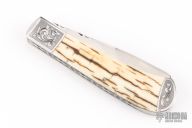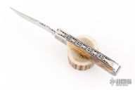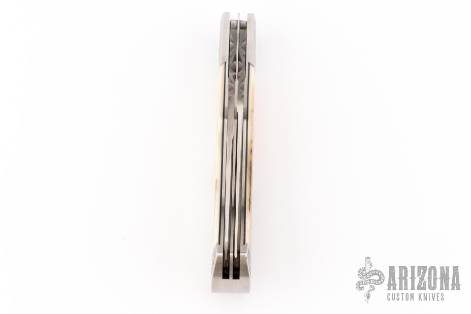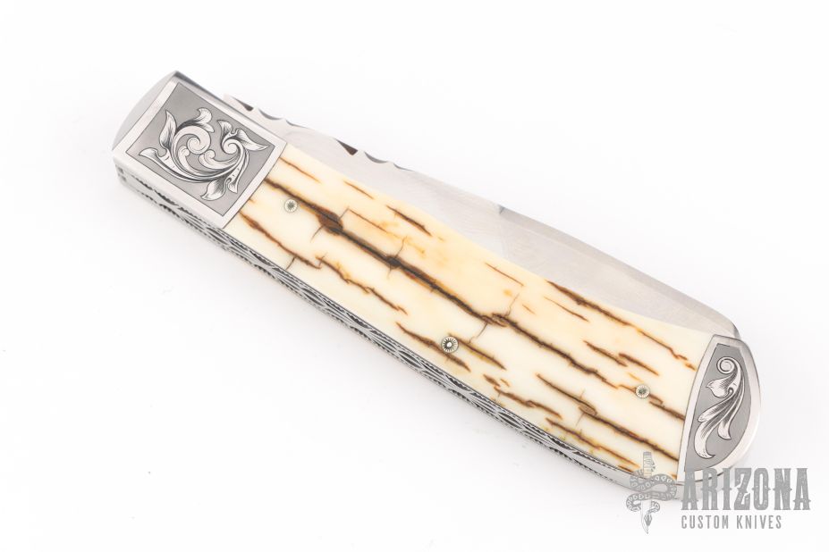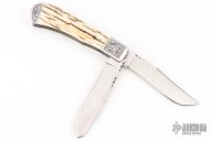 This Two-Blade Trapper by Bill Ruple features hand rub satin finished blades with nail nicks. The handle has satin finished stainless steel bolsters, mammoth ivory covers, fileworked stainless steel liners and stainless steel springs. Front and rear bolsters have been engraved. Half stop blade positioning on both blades, flush in all positions. Comes with soft pouch. Has a couple light scuffs, and scratches. Excellent condition.