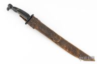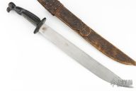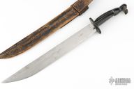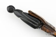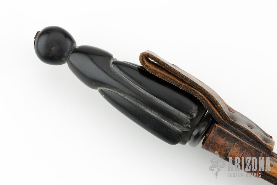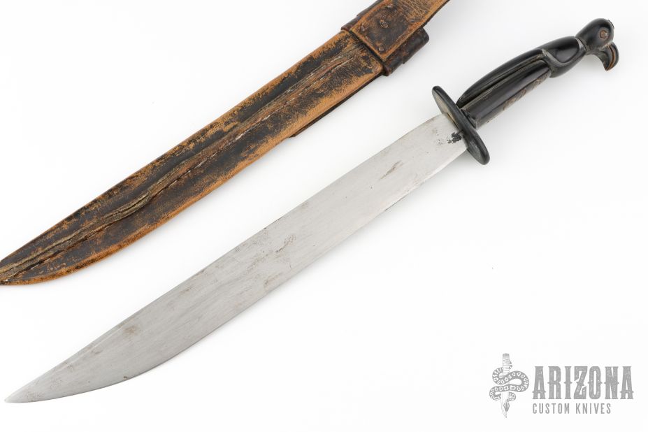 This knife features a satin finished blade with .116" blade stock and 1.352" blade depth, hidden tang construction. The handle consists of several pieces of buffalo horn that have been carved with a birds head and body standing atop a totem face. Comes with a hand tooled brown leather sheath with matching bird on the front. Has some scratches and light oxidation, otherwise good condition.