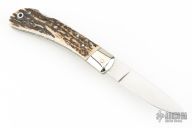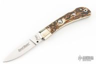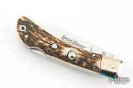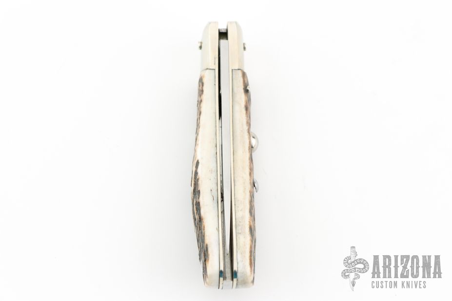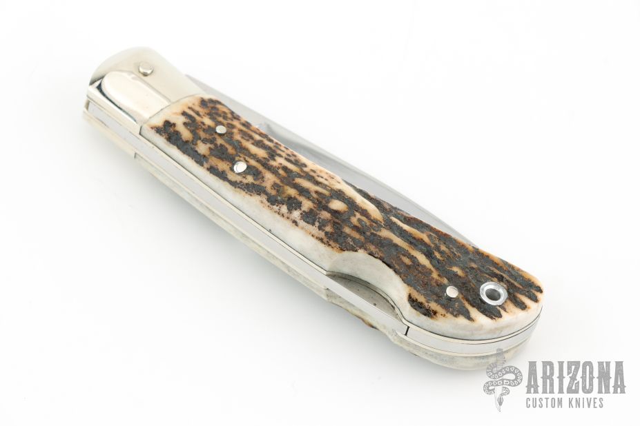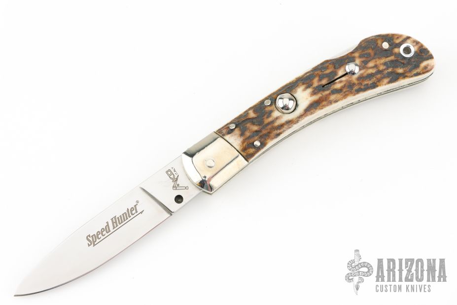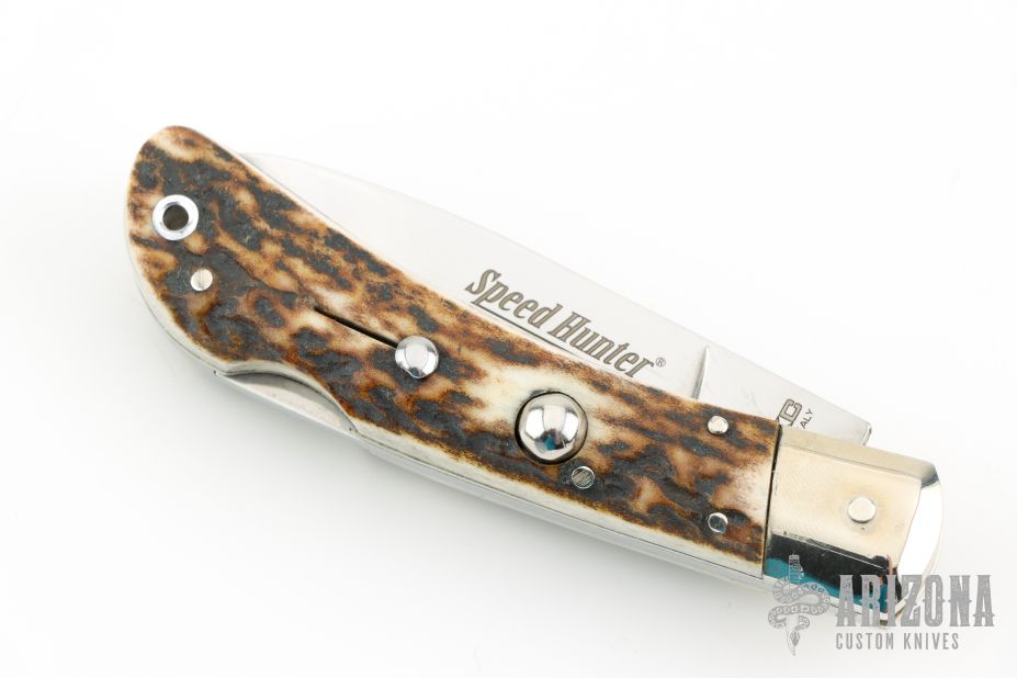 This Speed Hunter has a mirror polished blade, high polish nickel silver bolsters, and stag scales, stainless steel liners. Well made with quick strong action. Slide safety switch. Has a couple light scuffs and scratches excellent condition otherwise.