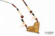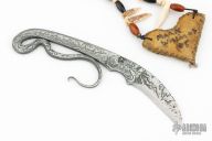 This neck knife by Mark Williams features a forged Damascus blade and handle, .204" blade stock and .790" blade depth, full tang construction. Comes with with a leather necklace with a leather heart and beads, the leather heart has magnets in it for the neck knife to stick to. Has some light scratches and oxidation spots, otherwise good condition. (i do not recommend wearing this as a neck knife)