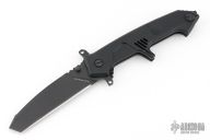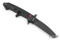 Linerlock folder. Tactical black coating on blade and handle. Blade designed for maximum penetration. Double guard and belt cutter. Glass breaker. Safety lock. Comes with nylon belt sheath. Has a couple light scuffs and scratches. Great condition otherwise.