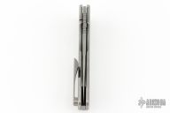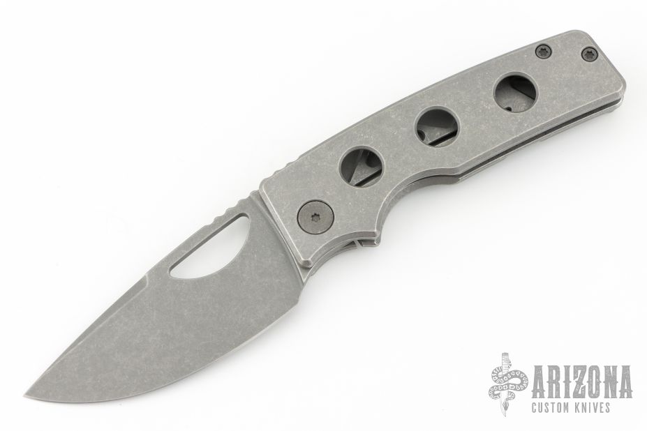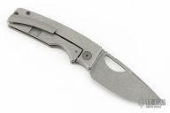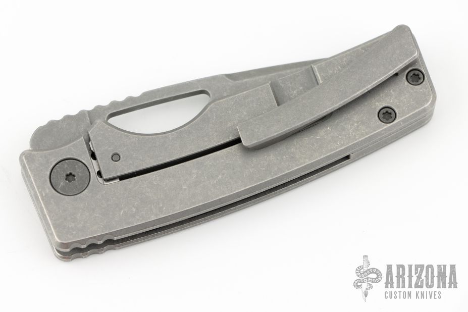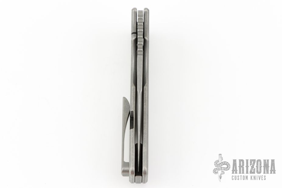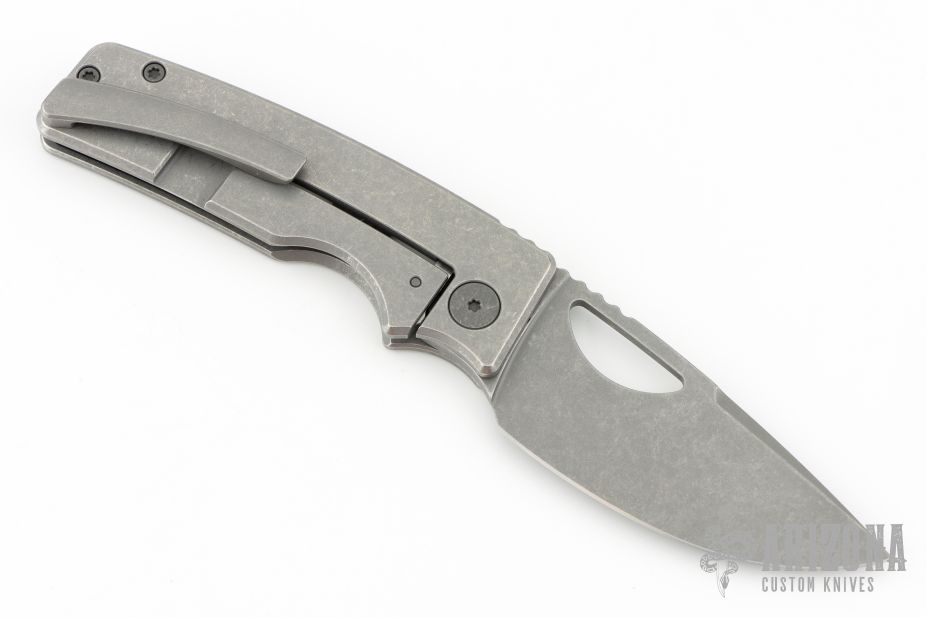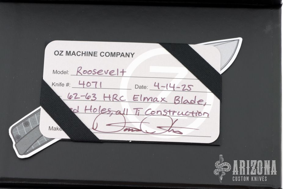 This knife by the OZ Machine Company features a tumbled Elmax blade with thumbhole and notched thumbrest. The handle features a tumble finished titanium frame with a matching titanium backspacer and tip up clip with hidden screws. Includes box and papers dated 4-15-25 and s/n 4071. Excellent condition.