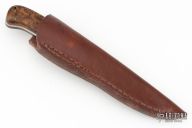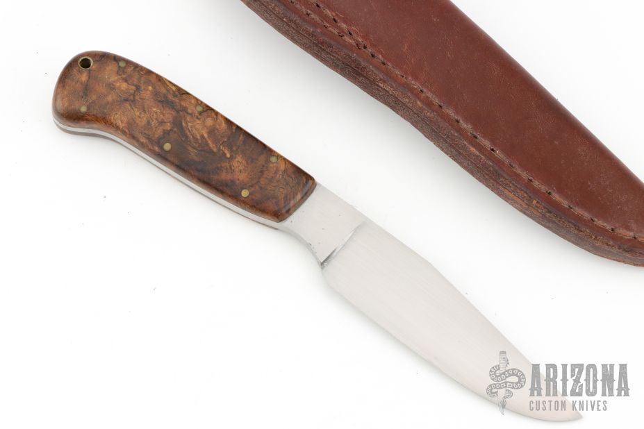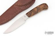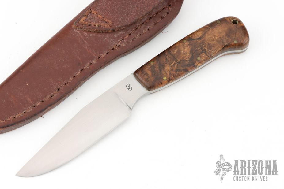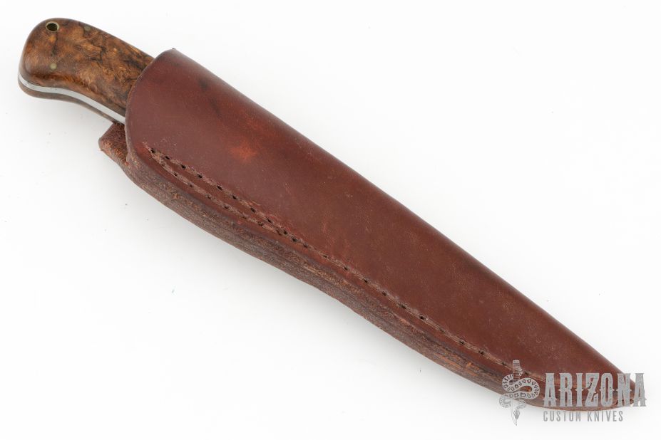 This knife by Jon P Christensen features a hand rub satin finished blade with visible temper line, .188" blade stock and 1" blade depth, full tapered tang construction. The handle has spalted wood scales with brass pins and lanyard hole. Comes with a brown leather sheath. Has a couple light scratches, otherwise excellent condition.